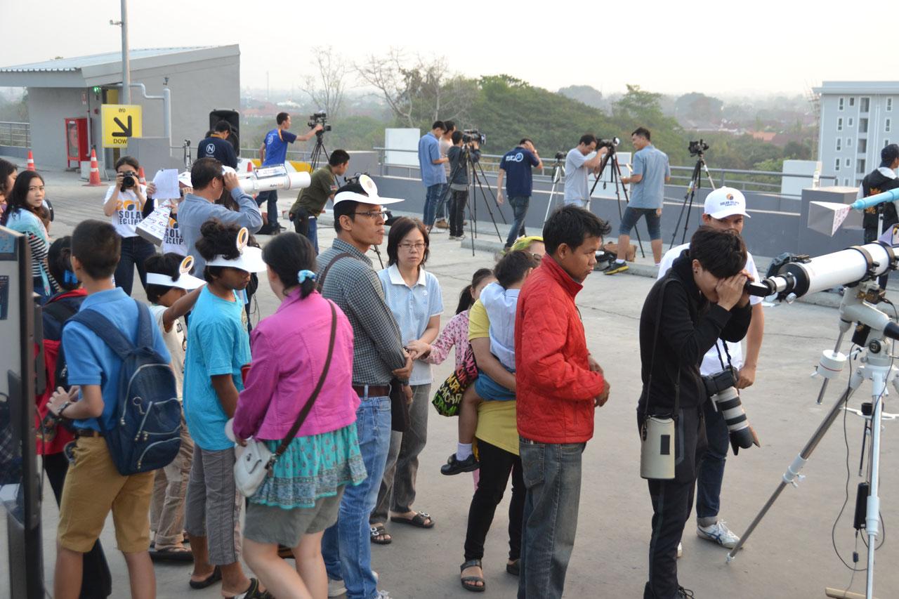 เมื่อเวลา 07.00 น. วันที่ 9 มี.ค.59 บรรยากาศการรอชมปรากฏการณ์ธรรมชาติสุริยุปราคาบางส่วนที่จังหวัดเชียงใหม่ เริ่มกันตั้งแต่เช้ามืด ที่ลานดาดฟ้าห้างเซ็นทรัลเฟสติวัลเชียงใหม่ ทางสถาบันวิจัยดาราศาสตร์ ได้นำอุปกรณ์กล้องดูดาวมาตั้งให้ประชาชนที่สนใจรวมทั้งนักเรียนนักศึกษาได้ชม ซึ่งมีผู้สนใจมารอชมปรากฏการณ์ดังกล่าวกันเป็นจำนวนมาก