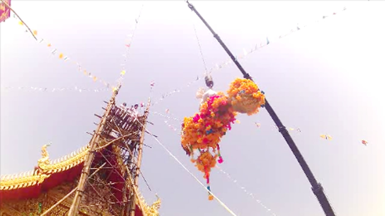 พุทธศาสนิกชนนับพันคนร่วมพิธีทำบุญ ยกช่อฟ้าขึ้นสู่บนหลังคาอุโบสถวัดพระธาตุโพธิ์งาม ต.ดอกคำใต้ อ.ดอกคำใต้ จ.พะเยา โดยที่ฮือฮาคือการนำรถเครนมาใช้ยกช่อฟ้าขึ้นสู่บนหลังคาอุโบสถ แทนการใช้รอกสลิงดึง ชาวบ้านตะลึงเจอแบบนี้ครั้งแรก...