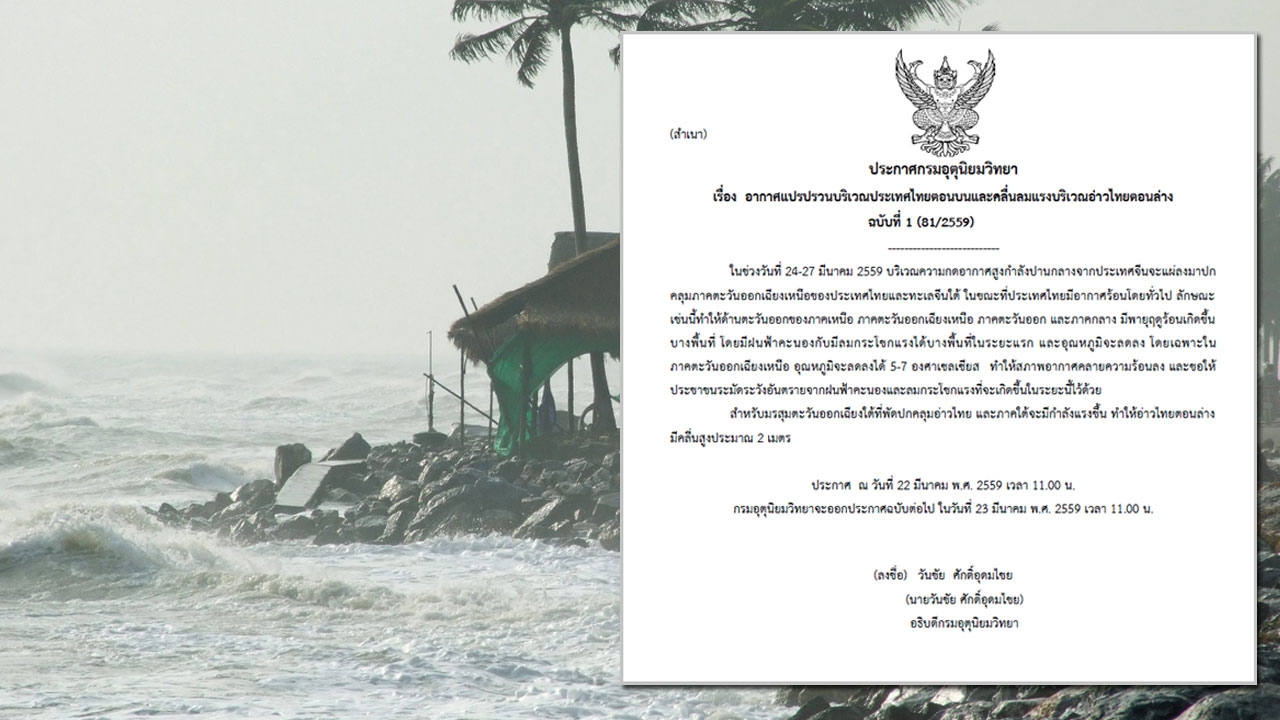 เมื่อเวลา 11.00 น. วันที่ 22 มี.ค. 59 กรมอุตุนิยมวิทยา ออกประกาศ "อากาศแปรปรวนบริเวณประเทศไทยตอนบนและคลื่นลมแรงบริเวณอ่าวไทยตอนล่าง" ฉบับที่ 1 ระบุว่า ในช่วงวันที่ 24-27 มีนาคม 2559 บริเวณความกดอากาศสูงกำลังปานกลางจากประเทศจีน จะแผ่ลงมาปกคลุมภาคตะวันออกเฉียงเหนือของประเทศไทยและทะเลจีนใต้ ในขณะที่ประเทศไทยมีอากาศร้อนโดยทั่วไป ลักษณะเช่นนี้ทำให้ด้านตะวันออกของภาคเหนือ ภาคตะวันออกเฉียงเหนือ ภาคตะวันออก และภาคกลาง มีพายุฤดูร้อนเกิดขึ้นบางพื้นที่ โดยมีฝนฟ้าคะนองกับมีลมกระโชกแรงได้บางพื้นที่ในระยะแรก และอุณหภูมิจะลดลง โดยเฉพาะในภาคตะวันออกเฉียงเหนือ อุณหภูมิจะลดลงได้ 5-7 องศาเซลเซียส ทำให้สภาพอากาศคลายความร้อนลง และขอให้ประชาชนระมัดระวังอันตรายจากฝนฟ้าคะนอง และลมกระโชกแรงที่จะเกิดขึ้นในระยะนี้ไว้ด้วย