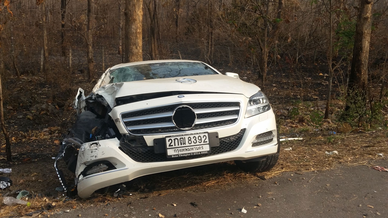 บริเวณริมถนนห่างจากซากรถปิกอัพ พบรถยนต์เก๋ง ยี่ห้อเบนซ์ สีขาว ทะเบียน 2 กฒ 8392 กรุงเทพมหานคร ด้านขวาพังทั้งแถบ ถุงลมนิรภัยกางทั้งสองข้าง มีผู้ได้รับบาดเจ็บ 3 ราย เจ้าหน้าที่กู้ภัยนำส่ง รพ.ลำปาง แล้วเช่นกัน