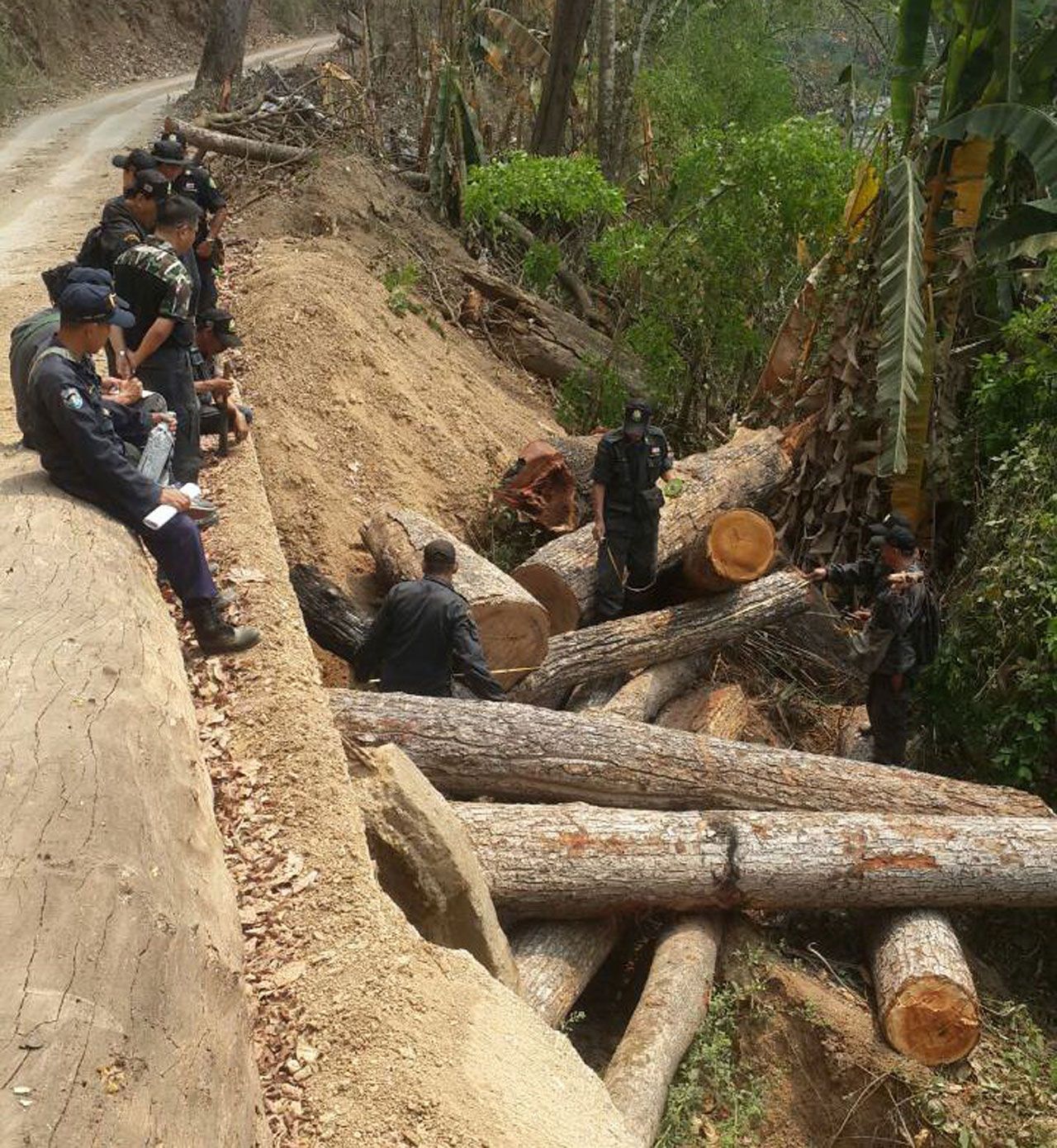 พบมีการลักลอบตัดไม้สักและไม้กระยาเลย ตามแนวเส้นทางระหว่างที่ทำการ อช.แม่เงา ถึงบ้านแม่หลุย อ.สบเมย ระยะทางกว่า 7 กม.ในเขตป่าสงวนแห่งชาติ ป่าแม่ยวมฝั่งซ้าย แปลง2 จนท.สอบพบ จนท.การไฟฟ้าฯ ตัดเพื่อขยายเสาไฟฟ้าเข้าหมู่บ้าน...