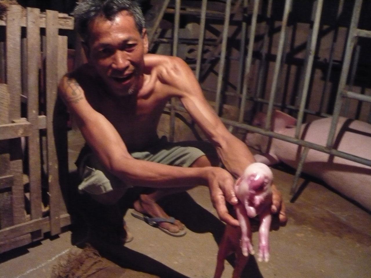 จากการสอบถาม นายสุทัน ขอรสกลาง อายุ 50 ปี บอกว่าตนมีอาชีพเกษตรกรรม และเลี้ยงแม่หมูเพาะขายเป็นรายได้เสริมมาเกือบ 20 ปีแล้ว สำหรับแม่หมูตัวนี้เป็นท้องแรก และเลยเวลาออกลูกมาแล้ว 4 วัน แต่ตอนหัวค่ำสังเกตเห็นแม่หมูมีอาการใกล้ออกลูก จึงเฝ้าระวังช่วยเหลือ 3 ตัวแรกออกลูกมาปกติ แต่พอตัวที่ 4 ออกมาตนถึงกับตกใจ เพราะลูกหมูมีลำตัวเดียว 4 ขา 2 หู ไม่มีหาง มีลูกตาเดียวขนาดใหญ่เหนือดวงตามีงวงคล้ายงวงช้างงอกออกมายาวประมาณ 10 ซม. ตนเพิ่งเคยพบเห็น นับว่าลูกหมูตัวนี้ถือว่าแปลกมาก มีลักษณะรูปร่างคล้ายช้าง มีงวงตรงหัว แต่เสียดายที่ออกมาได้แค่ 3 ชม.ก็ตาย คงเป็นเพราะว่ามีอวัยวะผิดปกติ ผิดธรรมชาติเพียง 1 ตัว ส่วนตัวที่ 5 ตัวสุดท้ายก็ออกมาเป็นปกติเหมือน 3 ตัวแรก เชื่อว่าเป็นของแปลกที่มาให้โชคลาภ ตามความเชื่อ