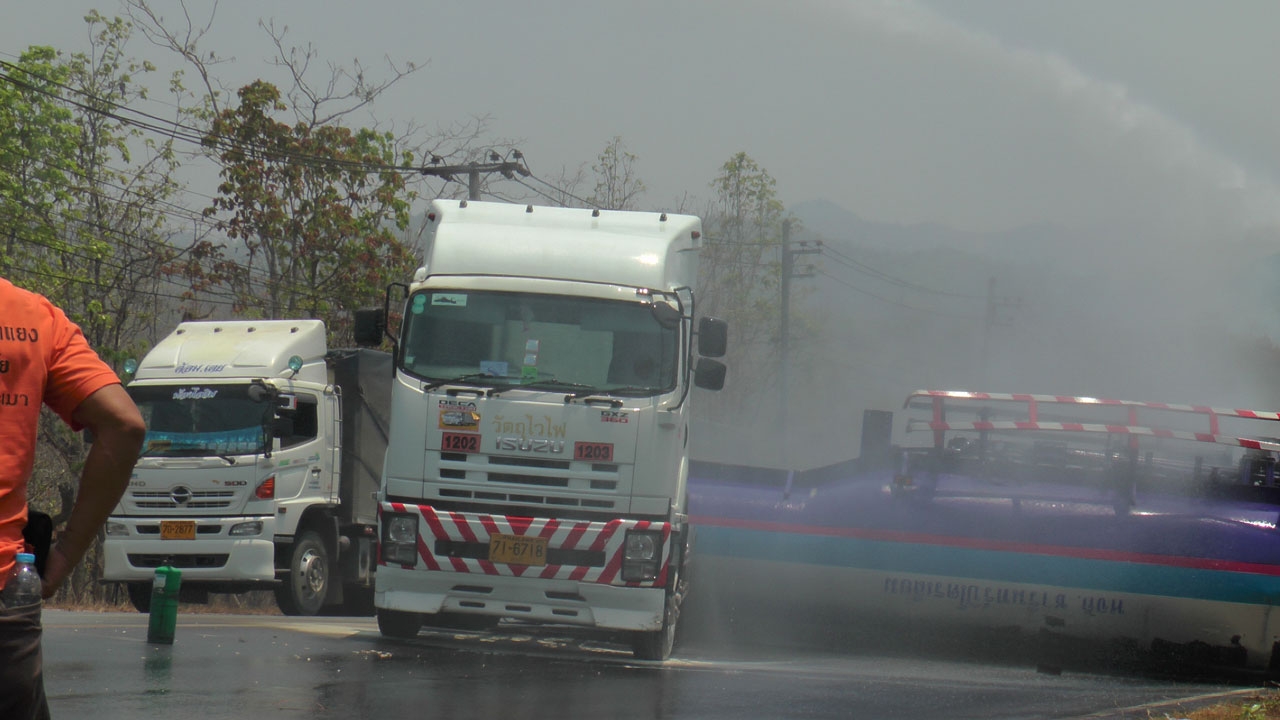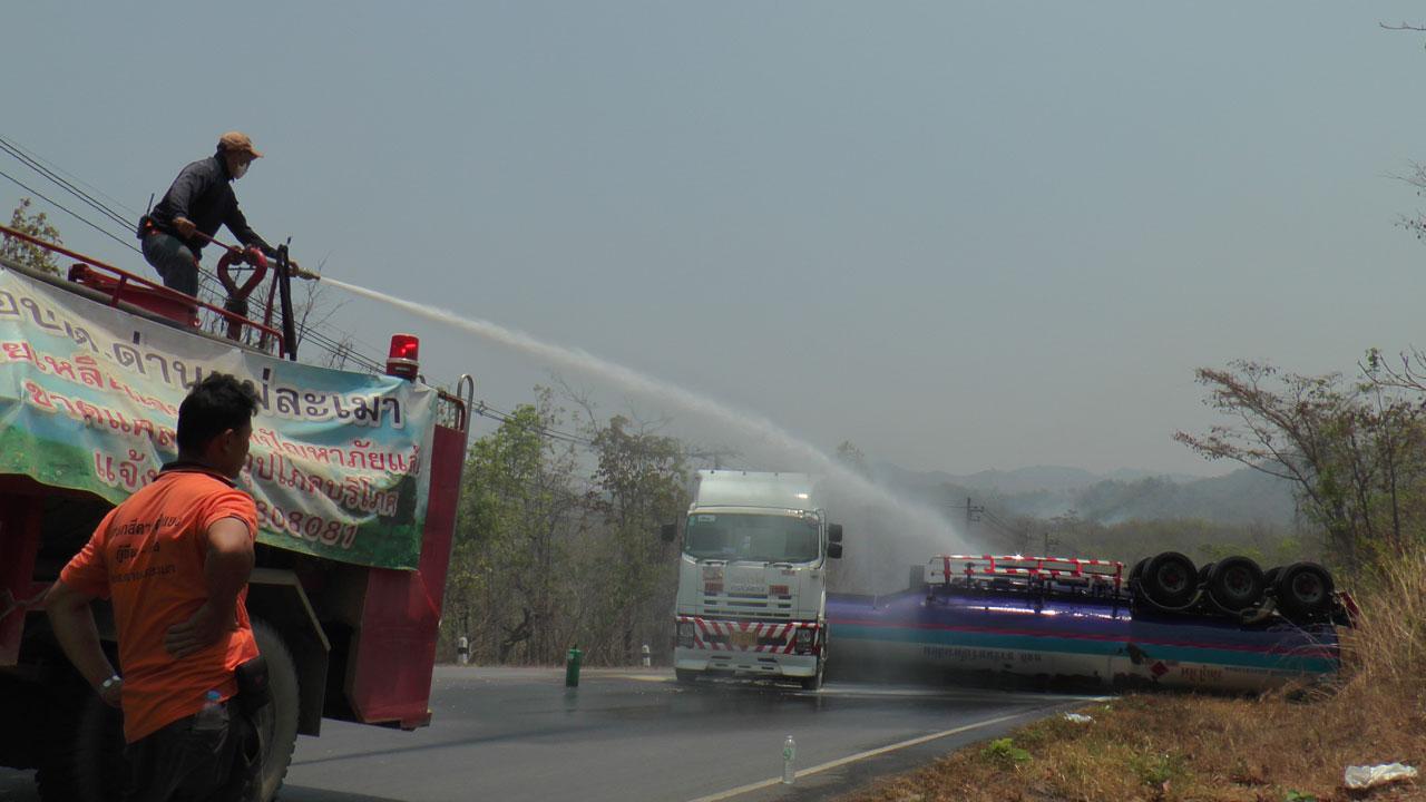 เกิดอุบัติเหตุรถพ่วงบรรทุกน้ำมัน 18 ล้อ เสียหลักพลิกคว่ำบนถนนสายตาก-แม่สอด ประมาณ กม. 40 ทำให้น้ำมันเบนซินกว่า 4 หมื่นลิตรรั่วทะลักออกจากถัง ไหลนองเต็มถนน...