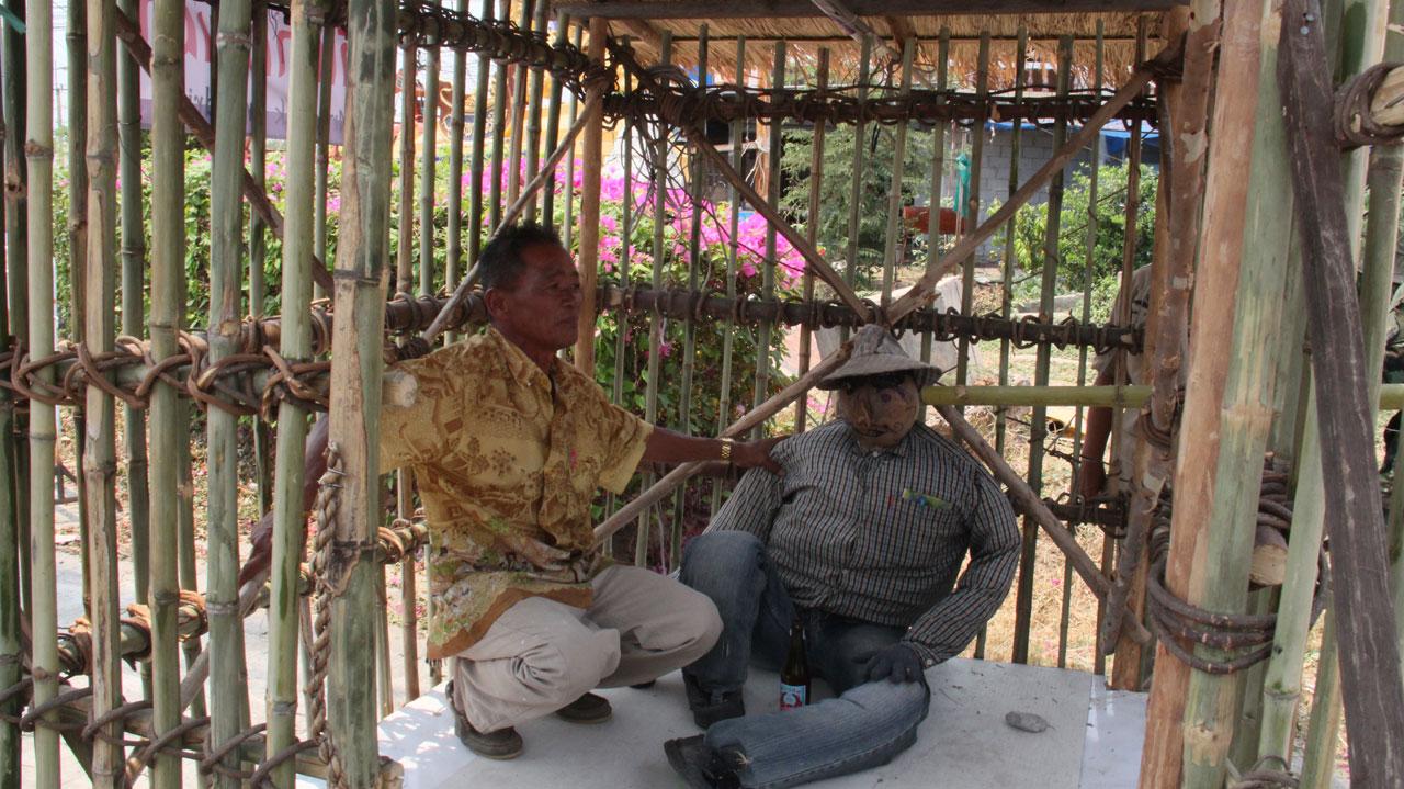 นายอำเภอทองแสนขัน อุตรดิตถ์ ไอเดียสุดเก๋! สร้างที่พักคนเมา ด้วยกรงขังไม้ไผ่ พร้อมหุ่นตุ๊กตาคน ใช้วัสดุที่หาได้ง่ายในหมู่บ้าน มีป้ายข้อความติดหน้ากรง จำลองภาพเหตุการณ์คนที่เมาแล้วขับ หวัง เตือนสติช่วงสงกรานต์ ...