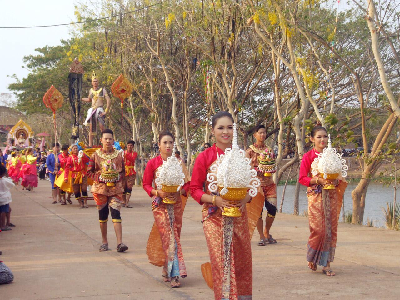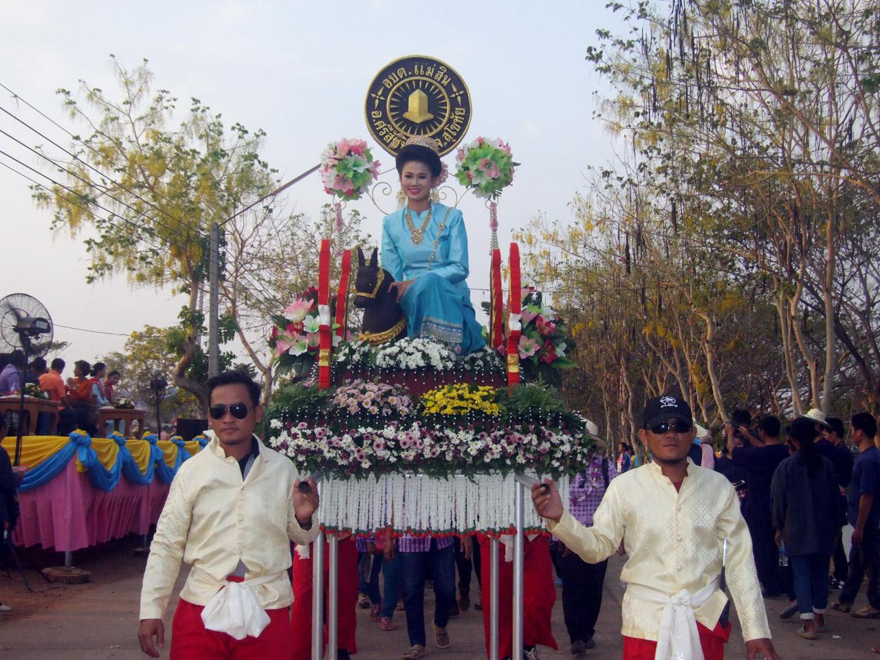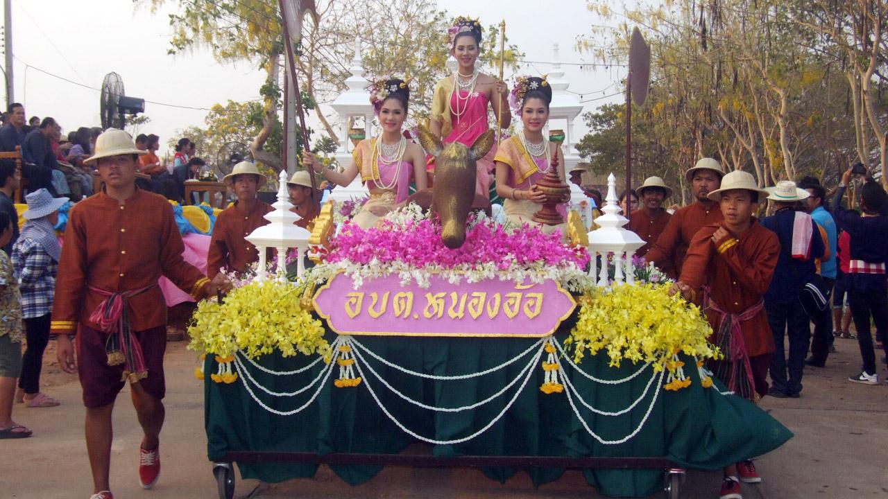 ทั้งนี้ ได้มีขบวนช้างพ่อเมืองแห่ข้ามแม่น้ำยม เดินเข้าสู่บริเวณงาน ตามด้วยขบวนแห่จากองค์การบริหารส่วนตำบลใน อ.ศรีสัชนาลัย กว่า 10 ขบวนอย่างยิ่งใหญ่ ซึ่งถูกจัดแต่งอย่างสวยงามโดยแสดงให้เห็นถึงวิถีชีวิตของชาวสุโขทัย และอุปนิสัยที่ชอบทำบุญสุนทาน สมดั่งคำจารึกของพ่อขุนรามคำแห่งในหลักศิลาจารึกที่ว่า อันคนสุโขทัยนี้ มักทรงศีล มักโอยทาน โดยมีนักท่องเที่ยวกว่า 2 พันคน ที่เบียดเสียดกันเข้ามาชมความงดงามของขบวนแห่ ท่ามกลางอากาศที่ร้อนอบอ้าว
