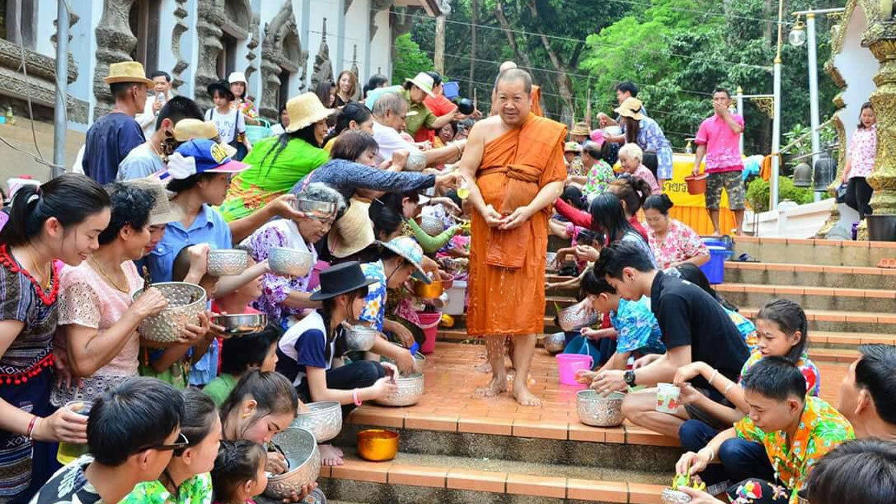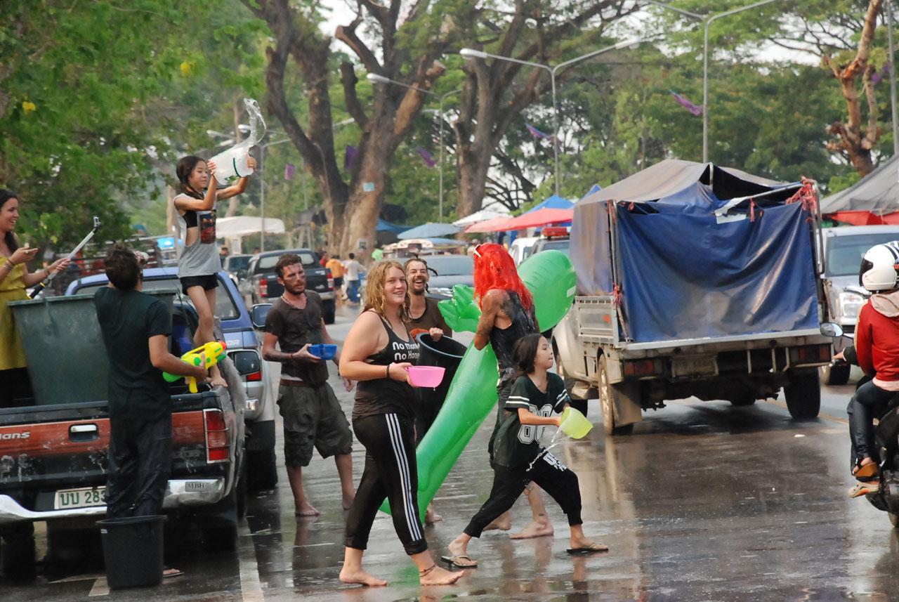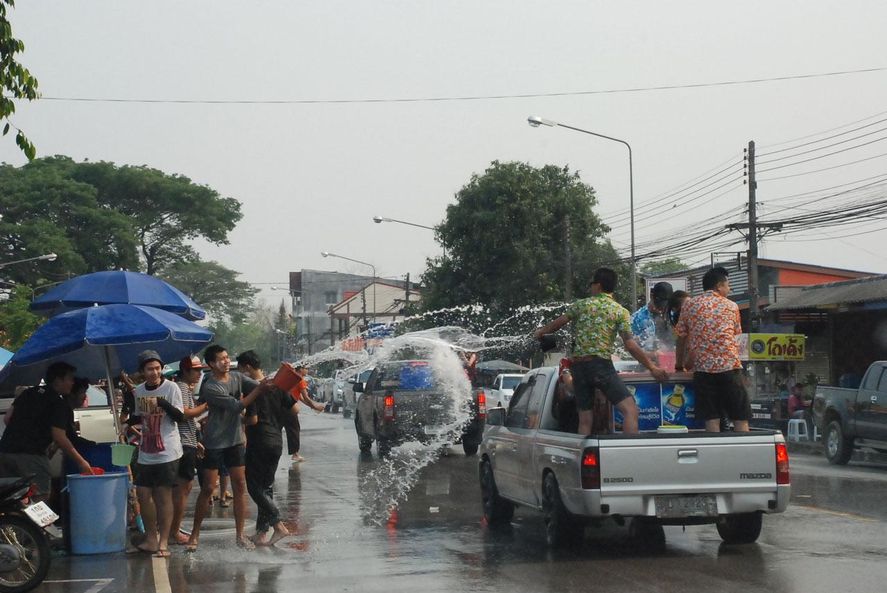 ขณะที่ บริเวณสามเหลี่ยมทองคำ อ.เชียงแสน มีนักท่องเที่ยวแห่กันนั่งเรือชมแม่น้ำโขงกันเป็นจำนวนมาก ตามถนนริมโขงมีการนำถังน้ำขนาดใหญ่มาตั้งเรียงราย แล้วใช้เครื่องสูบน้ำจากแม่น้ำโขงขึ้นมาสาดใส่ผู้ที่ขับขี่รถสัญจรผ่านไปมา นักท่องเที่ยวต่างถิ่นก็จะใช้รถปิกอัพใส่ถังน้ำไว้ท้ายรถสาดเล่นกับคนที่อยู่ริมถนนอย่างสนุกสนาน เป็นการคลายความร้อนที่อบอ้าวไปได้อย่างมาก ทำให้รถติดยาวเหยียดเป็นช่วงๆ โดยเฉพาะถนนริมโขง ในเขตเทศบาลตำบลเวียงเชียงแสน ตั้งแต่หน้าหน่วย นรข.เขตเชียงราย ไปจนถึงหน้าวัดพระขาวป้าน ทำให้ถนนสายนี้กลายเป็นถนนสายเล่นน้ำตลอดสาย มีการตั้งเครื่องสูบน้ำโขงขึ้นมาใส่ถังขนาด 200 ลิตร เรียงรายเป็นจุดๆ สาดใส่รถกระบะที่มีคนนั่งท้ายรถที่ผ่านไปมา ทำให้ถนนเจิ่งนองไปด้วยน้ำ บางราย นำถังน้ำ 200ลิตร ใส่ไว้กระบะท้ายรถ ตระเวนเล่นสาดน้ำใส่กัน สร้างความชุ่มฉ่ำคลายความร้อนที่อุณหภูมิสูงถึง 40 องศาลงไปได้