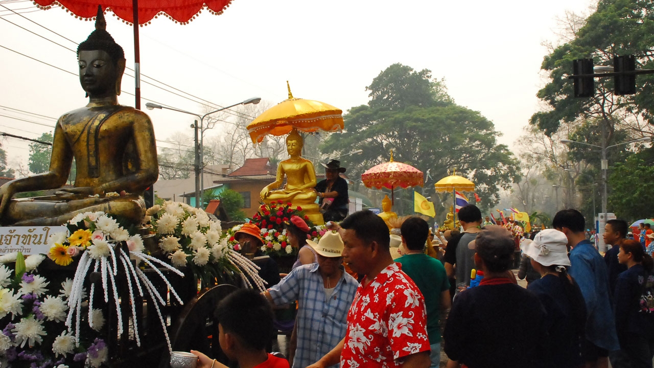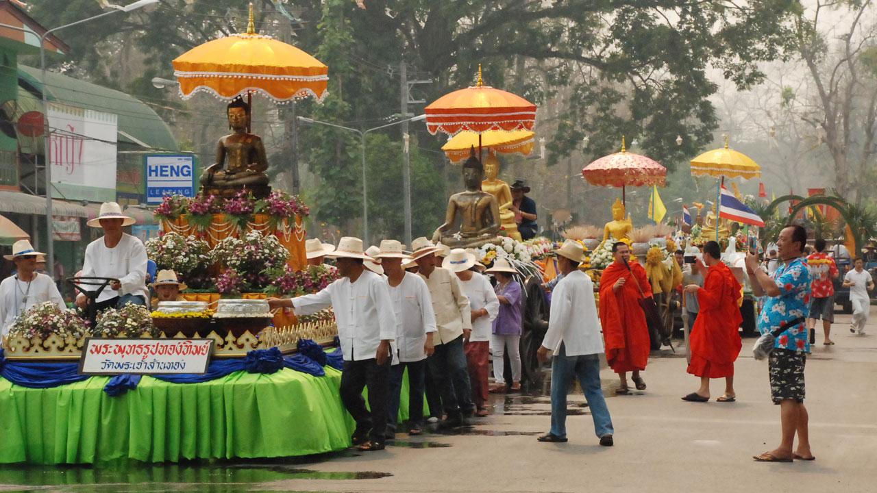 นายพินิจ แก้วจิตคงทอง นายอำเภอเชียงแสน กล่าวว่า สงกรานต์เมืองเชียงแสนปีนี้ มีนักท่องเที่ยวและพี่น้องชาวลาวข้ามแม่น้ำโขงมาเที่ยวชมขบวนแห่พระพุทธรูป พระเจ้าทองทิพย์ พระเจ้าทันใจ พระคู่บ้านคู่เมืองเชียงแสน และสรงน้ำพระพุทธรูป ซึ่งแต่ละขบวนถูกตกแต่งอย่างสวยงาม โดยแสดงให้เห็นถึงวิถีชีวิตของแต่ละชุมชนสองฟากถนน เนืองแน่นไปด้วยนักท่องเที่ยว เบียดเสียดกันเข้าชมความงดงามของขบวนแห่ ท่ามกลางอากาศที่ร้อนอบอ้าว ขณะที่ขบวนแห่ผ่าน นักท่องเที่ยวก็จะรดน้ำให้กับผู้อยู่ในขบวน เพื่อเป็นการคลายร้อน และเทศบาลตำบลเวียงเชียงแสนได้นำรถดับเพลิงออกฉีดพ่นน้ำในอากาศ เพื่อลดอุณหภูมิที่สูงถึง 38 องศาเซลเซียส