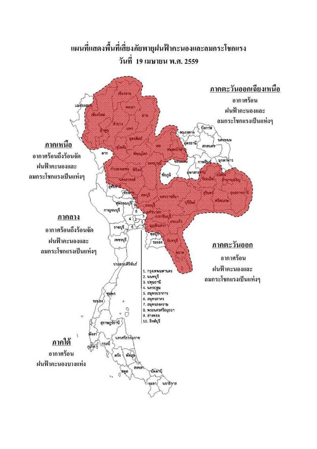 เมื่อเวลา 17.00 น. วันที่ 19 เม.ย. 59 กรมอุตุนิยมวิทยา ออกประกาศ "พายุฤดูร้อนบริเวณประเทศไทยตอนบน" ฉบับที่ 6 ระบุว่า ในช่วงวันที่ 19-21 เมษายน 2559 บริเวณภาคเหนือ ภาคตะวันออกเฉียงเหนือ ภาคตะวันออก และภาคกลาง จะมีพายุฤดูร้อนเกิดขึ้น โดยมีลักษณะฝนฟ้าคะนอง ลมกระโชกแรง และมีลูกเห็บตกบางพื้นที่ ขอให้ประชาชนในบริเวณจังหวัดเชียงใหม่ เชียงราย ลำพูน ลำปาง พะเยา แพร่ น่าน กำแพงเพชร พิษณุโลก พิจิตร อุตรดิตถ์ เพชรบูรณ์ เลย หนองบัวลำภู ชัยภูมิ ร้อยเอ็ด นครราชสีมา ศรีสะเกษ สุรินทร์ บุรีรัมย์ อำนาจเจริญ อุบลราชธานี นครสวรรค์ ลพบุรี สระบุรี ปราจีนบุรี สระแก้ว ฉะเชิงเทรา จันทบุรี และตราด ระมัดระวังอันตรายจากพายุลมแรงที่จะเกิดขึ้น รวมถึงอยู่ห่างจากต้นไม้ใหญ่ ป้ายโฆษณา และสิ่งก่อสร้างที่ไม่แข็งแรง