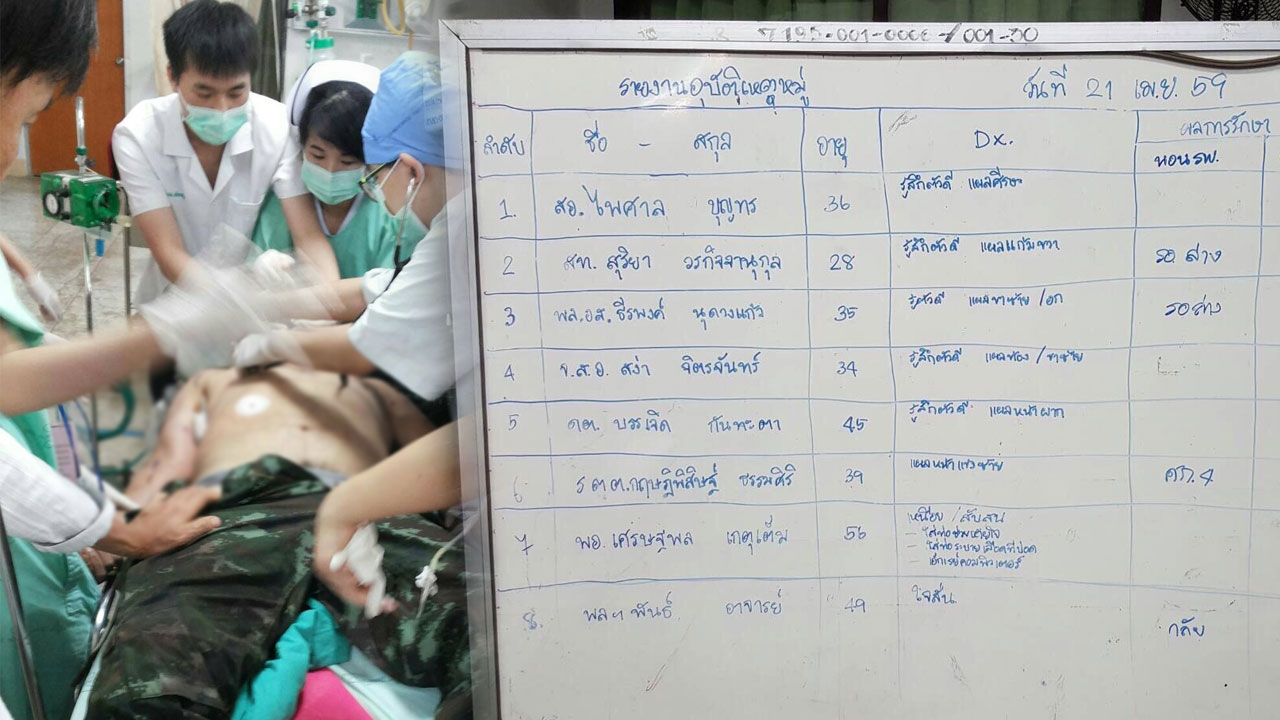 ขณะที่ผู้บาดเจ็บ ประกอบด้วยส.อ.ไพศาล บุญทร,สท.สุริยา วรกิจจานุกุล,พล.อส.ธีรพงศ์ นุดวงแก้ว,จ.ส.อ.สง่า จิตรจันทร์,ด.ต.บรรเจิด กันทะตา,ร.ต.ต.กฤษฎิพิศิษฐ์ ธรรมศิริ และพลทหารพันธ์ อาจารย์