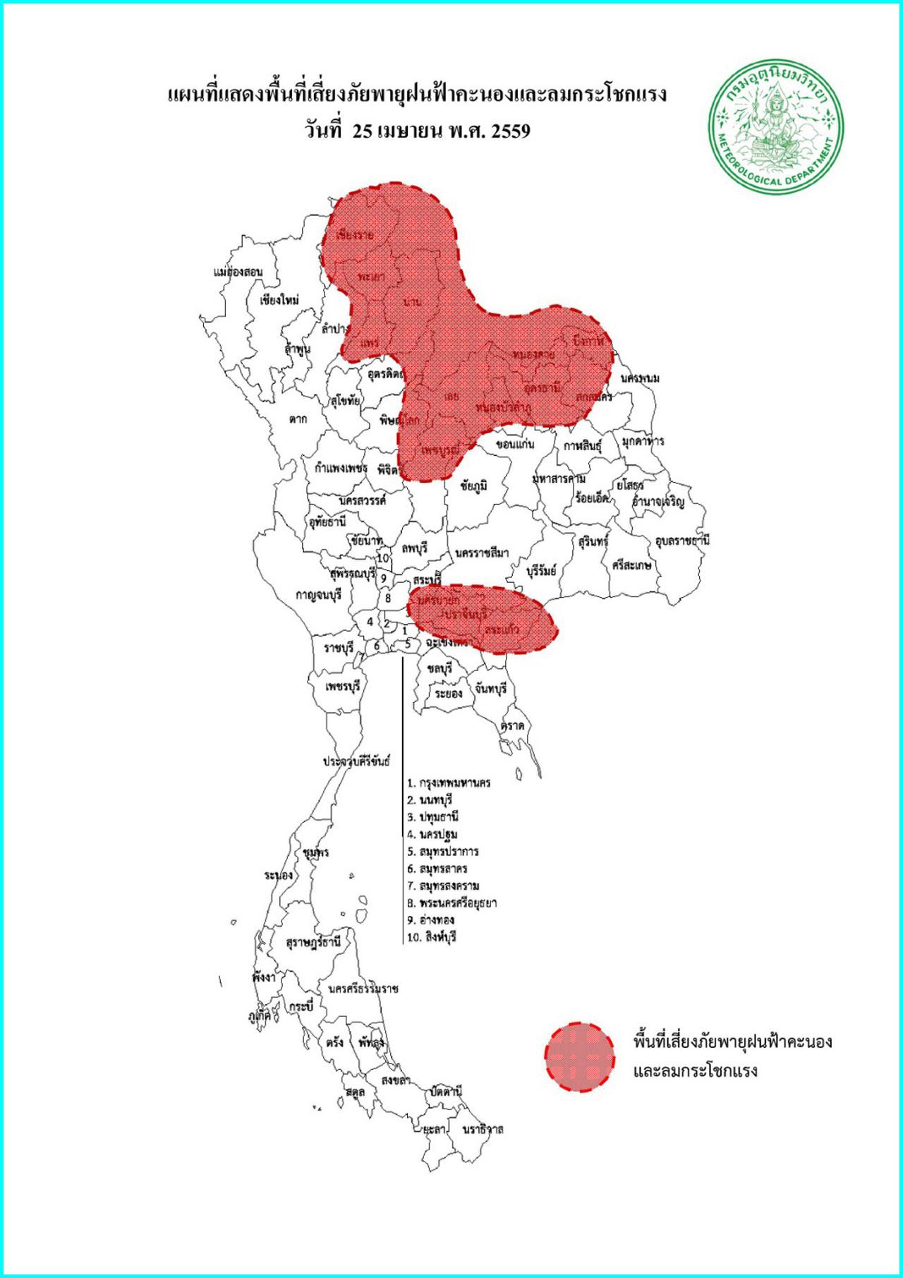 เมื่อเวลา 11.00 น. วันที่ 26 เม.ย. 59 กรมอุตุนิยมวิทยา ออกประกาศ "พายุฤดูร้อนบริเวณประเทศไทยตอนบน" ฉบับที่ 1 ระบุว่า ในช่วงวันที่ 28-30 เมษายน 2559 บริเวณด้านตะวันออกของภาคเหนือ ภาคตะวันออกเฉียงเหนือ ภาคตะวันออก และภาคกลาง จะมีพายุฤดูร้อนเกิดขึ้น โดยมีลักษณะฝนฟ้าคะนอง ลมกระโชกแรงและมีลูกเห็บตกบางพื้นที่ โดยจะเริ่มจากภาคตะวันออกเฉียงเหนือก่อน ขอให้ประชาชนในบริเวณดังกล่าว ระมัดระวังอันตรายจากพายุลมแรงที่จะเกิดขึ้น รวมถึงอยู่ห่างจากต้นไม้ใหญ่ ป้ายโฆษณา และสิ่งก่อสร้างที่ไม่แข็งแรง