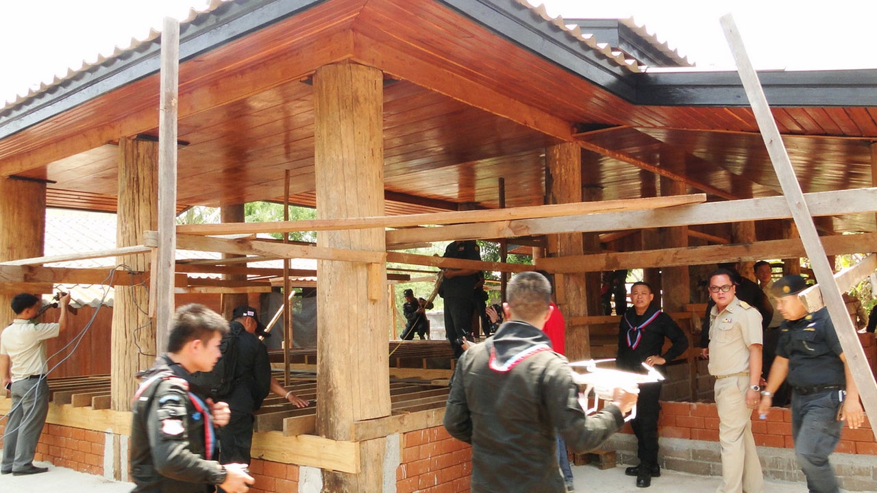 เมื่อช่วงบ่าย วันนี้ (26 เม.ย.59) พันเอกภาส วงศ์สารภี ผบ.ฉก.ทพ.ที่ 36 นายนิทรรศ เวชวินิจ ผอ.สำนักจัดการทรัพยากรป่าไม้ที่ 1 สาขาแม่ฮ่องสอน นายเล็ก วงษา ผอ.ส่วนป้องกันและควบคุมไฟป่า สำนักจัดการทรัพยากรป่าไม้ที่ 1 สาขาแม่ฮ่องสอน กรมป่าไม้ พ.ต.ท.ชาญวิทย์ ธรรมรัต รอง ผกก.สส. สภ.ขุนยวม นายชินวัตร์ ปุ๊ดภาษี ปลัดอำเภอฝ่ายป้องกัน อ.ขุนยวม นายทวี รัตนวงศ์ หัวหน้าหน่วยป้องกันรักษาป่าที่ มส 8 (หางปอน) ได้สนธิกำลัง ทหารพราน 36 ตำรวจภูธร ป่าไม้ ตชด.337 แม่สะเรียง เข้าตรวจสอบบ้านไม้สักหลังหนึ่งที่อยู่ระหว่างการก่อสร้าง ในบริเวณบ้านเลขที่ 37 บ้านหางปอน หมู่ 3 ต.เมืองปอน อ.ขุนยวม จ.แม่ฮ่องสอน