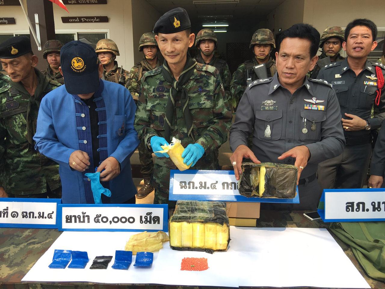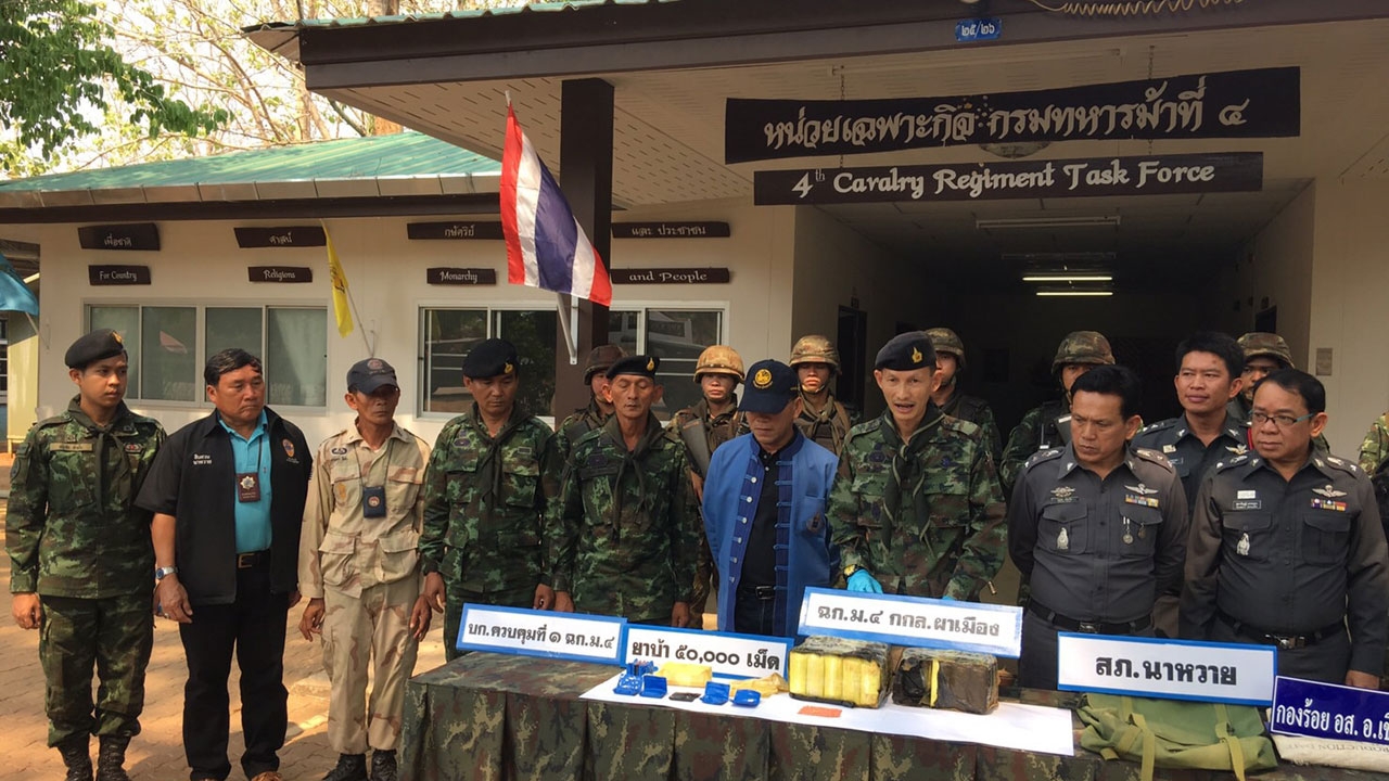 วันที่ 29 เม.ย.59 พ.อ.อาจิณ ปัทมจิตร รอง ผบ.ฉก.ม.4 กกล.ผาเมือง พร้อมด้วย พ.ต.อ.บุญลือ เอี่ยมใย ผกก.สภ.นาหวาย จ.เชียงใหม่ นายชูชัย โพธิ์ชัย ปลัดอาวุโส อ.เชียงดาว แถลงข่าว กรณียึดยาบ้า 50,000 เม็ด บริเวณช่องทางหนองกะลาง บ้านอรุโณทัย ม.10 ต.เมืองนะ อ.เชียงดาว จ.เชียงใหม่ เมื่อวันที่ 28 เม.ย.ที่ผ่านมา ณ หน่วยเฉพาะกิจกรมทหารม้าที่ 4 เชียงดาว