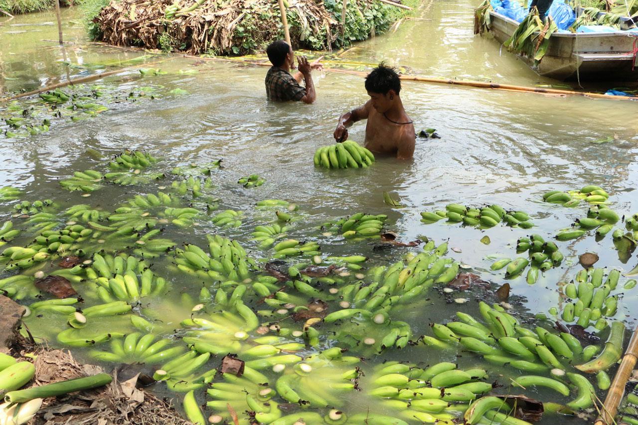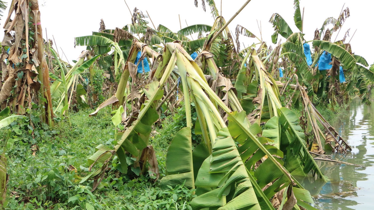 จากการเดินสำรวจพบว่าต้นกล้วยที่มีเครือใหญ่ๆ จะหนักมาก ทำให้ลมพัดจนหักกลางต้น ล้มระเนระนาดจำนวนมาก ส่วนที่ไม่ล้มก็เอน ใบกล้วยถูกลมตีจนฉีกขาดแตกหมด สภาพเสียหายทุกต้น ส่วนเครือกล้วยที่มีผลใหญ่ก็จะตัดไปชำแหละ แต่ในส่วนที่ต้นหักล้มกับพื้น เครือกล้วยจะกระแทกโดนพื้นทำให้มีตำหนิขายไม่ได้