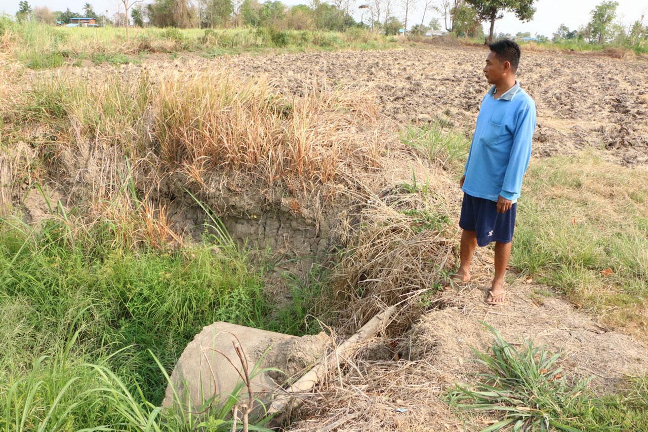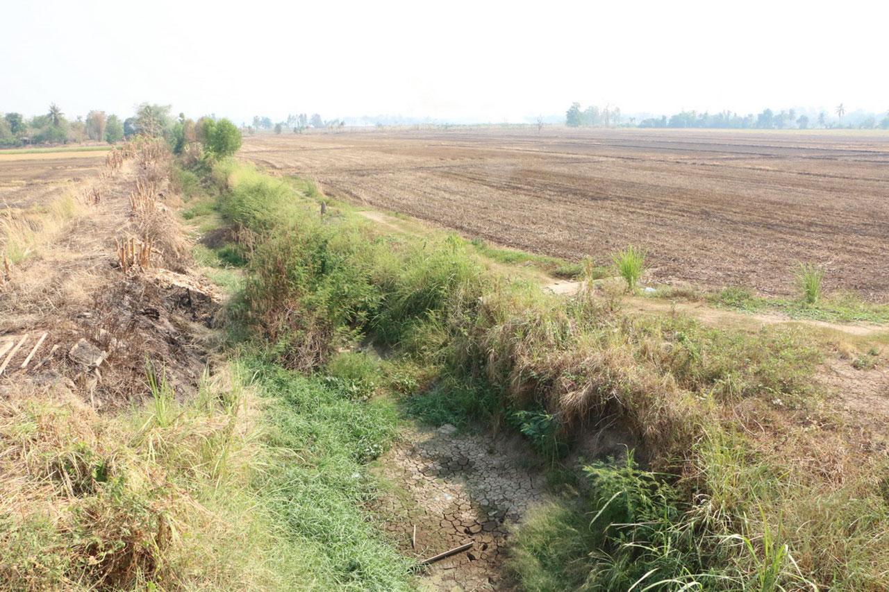 ส่วนคลองส่งน้ำที่อยู่กับผืนนานี้ ซึ่งปกติไม่เคยแห้ง อย่างน้อยก็ยังพอมีน้ำติดก้นคลองบ้าง และชาวนาใช้น้ำในคลองแห่งนี้ทำนา รวมทั้งสระใหญ่ของชาวบ้านที่ขุดไว้อีก 2 ลูกที่อยู่ใกล้กันซึ่งก็ไม่เคยแห้ง แต่ขณะนี้แห้งผากไม่มีน้ำเหลือติดก้นคลองและก้นสระเลย
