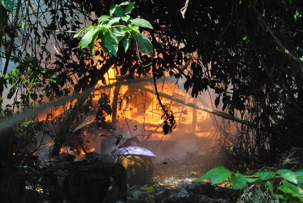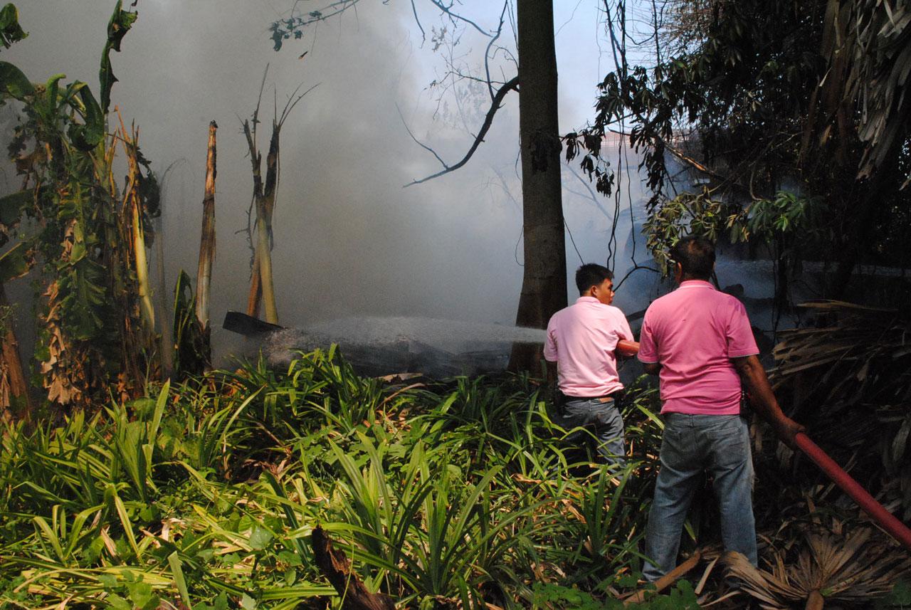 เมื่อไปถึงพบว่า บ้านหลังเกิดเหตุเป็นบ้านไม้ชั้นเดียว ยกพื้นสูง 1 เมตร สร้างอยู่ในสวนกล้วย ด้านหลังตึกแถวถนนหลวงพ่อเจ้า จนท.จึงช่วยกันระดมฉีดน้ำเพื่อดับไฟ แต่เนื่องจากบ้านที่เกิดเหตุเป็นบ้านไม้ และบริเวณรอบบ้านได้มีต้นกล้วยรวมทั้งเถาวัลย์แห้ง จึงเป็นเชื้อเพลิงอย่างดีจึงทำให้บ้านไหม้หมดทั้งหลัง ซึ่ง จนท.ต้องใช้เวลาฉีดน้ำนานกว่าครึ่งชั่วโมงจึงควบคุมเพลิงไว้ได้