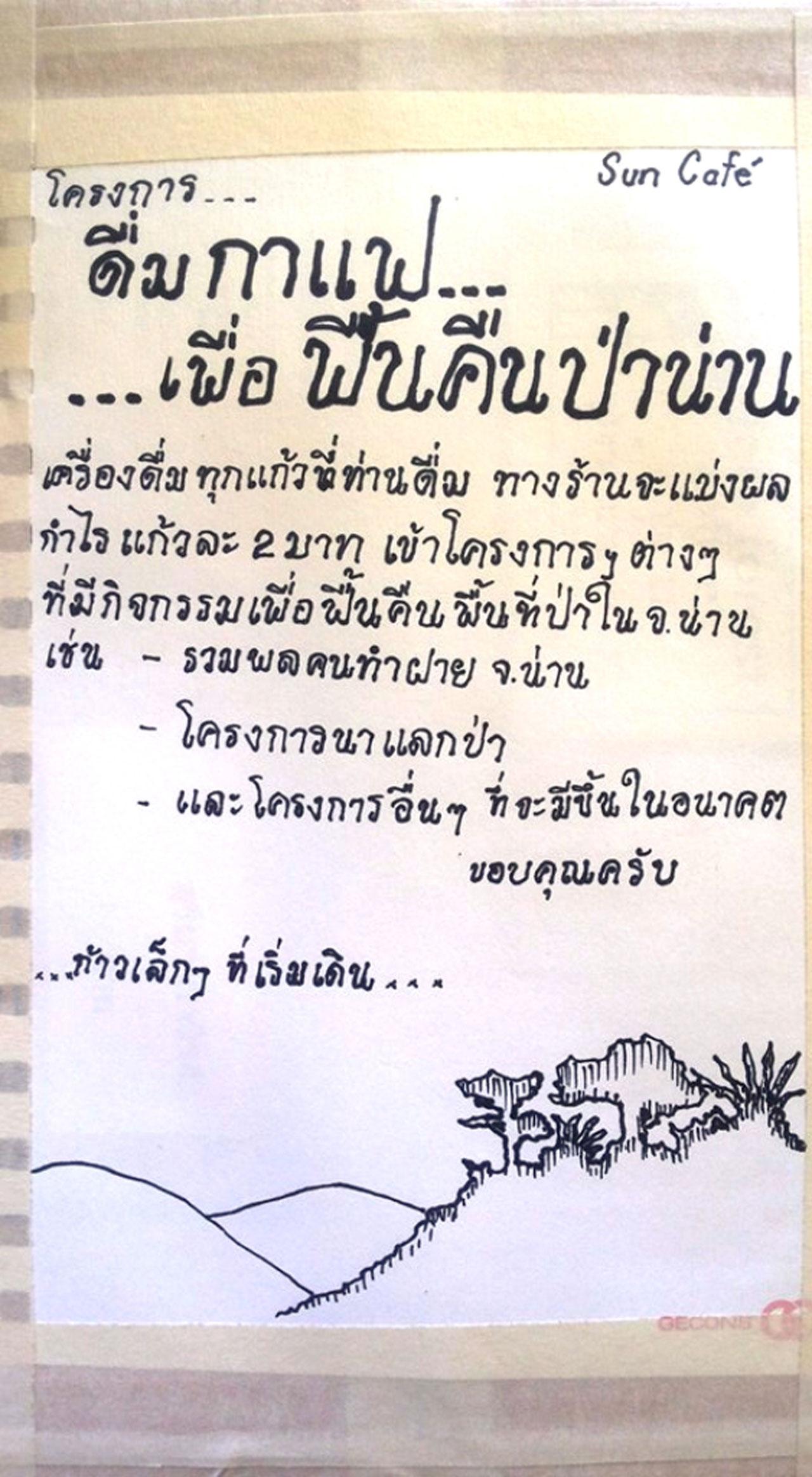 เมื่อวันที่ 12 พ.ค.2559 นายสุริยา กาวิรส หนุ่มวิศวกรเจ้าของร้านกาแฟ ซัน คอฟฟี่ บ้านแสงดาว ตำบลฝายแก้ว อำเภอภูเพียง จังหวัดน่าน ได้บรรเจิดไอเดีย กาแฟช่วยป่าน่าน โดยจะนำกำไรจากกาแฟ 1 แก้ว จำนวนเงิน 2 บาท นั้นจะนำไปสบทบทุนช่วยในการพื้นที่ป่าสีเขียวให้จังหวัดน่าน โดยจะมอบให้กับองค์กร หรือหน่วยงานต่างๆ ที่รับผิดชอบเรื่องการคืนพื้นที่ป่าสีเขียว หรือ ฟื้นฟูเขาหัวโล้น ถึงแม้จะไม่มาก แต่ก็ยังดีกว่าไม่ทำอะไร