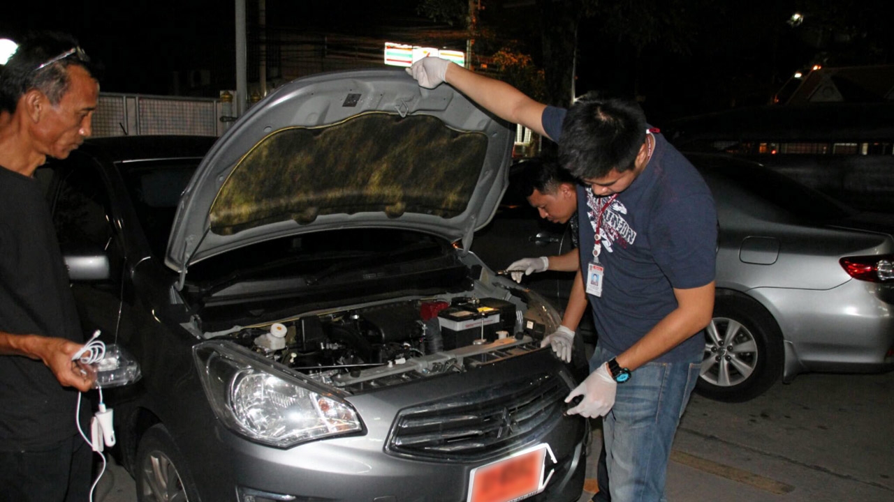เจ้าหน้าที่ตำรวจตรวจรถยนต์มิตซูบิชิ แอททราจ สีไทเทเนียม ทะเบียนป้ายแดง ย-8592 กรุงเทพมหานคร ของ น.ส.อัญชลี หรืออัน เทียนนาค (ภาพเล็ก) เหยื่อถูกฆ่าชิงทรัพย์ในห้องพักนิรันดร์ คอนโด ย่านประเวศ หลังนายเอ (นามสมมติ) อายุ 16 ปี ผู้ต้องหา ขับรถเข้า มอบตัว รับสารภาพว่าก่อเหตุจริง อ้างโกรธแค้นเพราะหึงหวงฝ่ายหญิง.