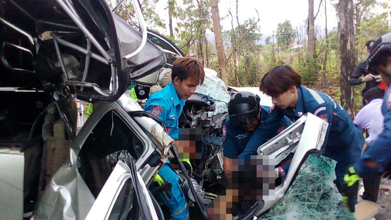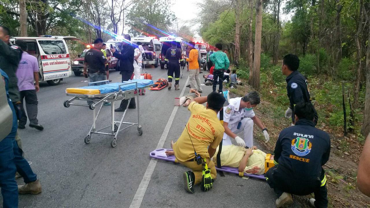 ที่เกิดเหตุพบรถกระบะ โตโยต้าไฮลักซ์ สีบรอนซ์เงิน ทะเบียน 1ฒช 4297 กรุงเทพมหานคร ด้านหลังกระบะมีผ้าใบสีดำคุมมิดชิด สภาพด้านหน้าพังยับเยินล้อหน้าด้านขวาหลุด พบคนขับเป็นชายไม่ทราบชื่อ เสียชีวิตคาที่นั่งด้านคนขับ พบผู้บาดเจ็บกระเด็นกระจัดกระจายเต็มถนน เจ้าหน้าที่ต้องใช้เครื่องตัดถ่างงัดเอาร่างผู้เสียชีวิตและบาดเจ็บออกจากซากรถ รวมมีผู้เสียชีวิต 1 ราย เจ็บสาหัส 6 ราย และ บาดเจ็บไม่สาหัส 7 ราย เจ้าหน้าที่นำตัวส่งโรงพยาบาลสมเด็จพระเจ้าตากสินมหาราช