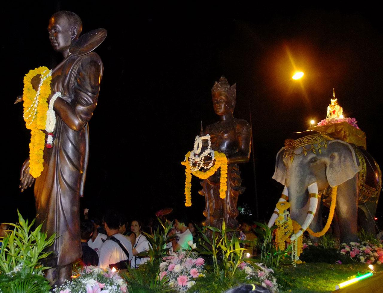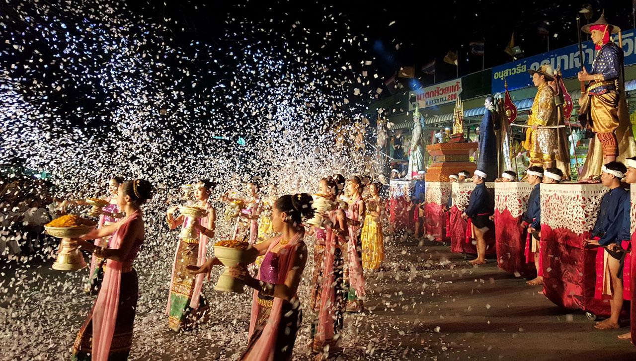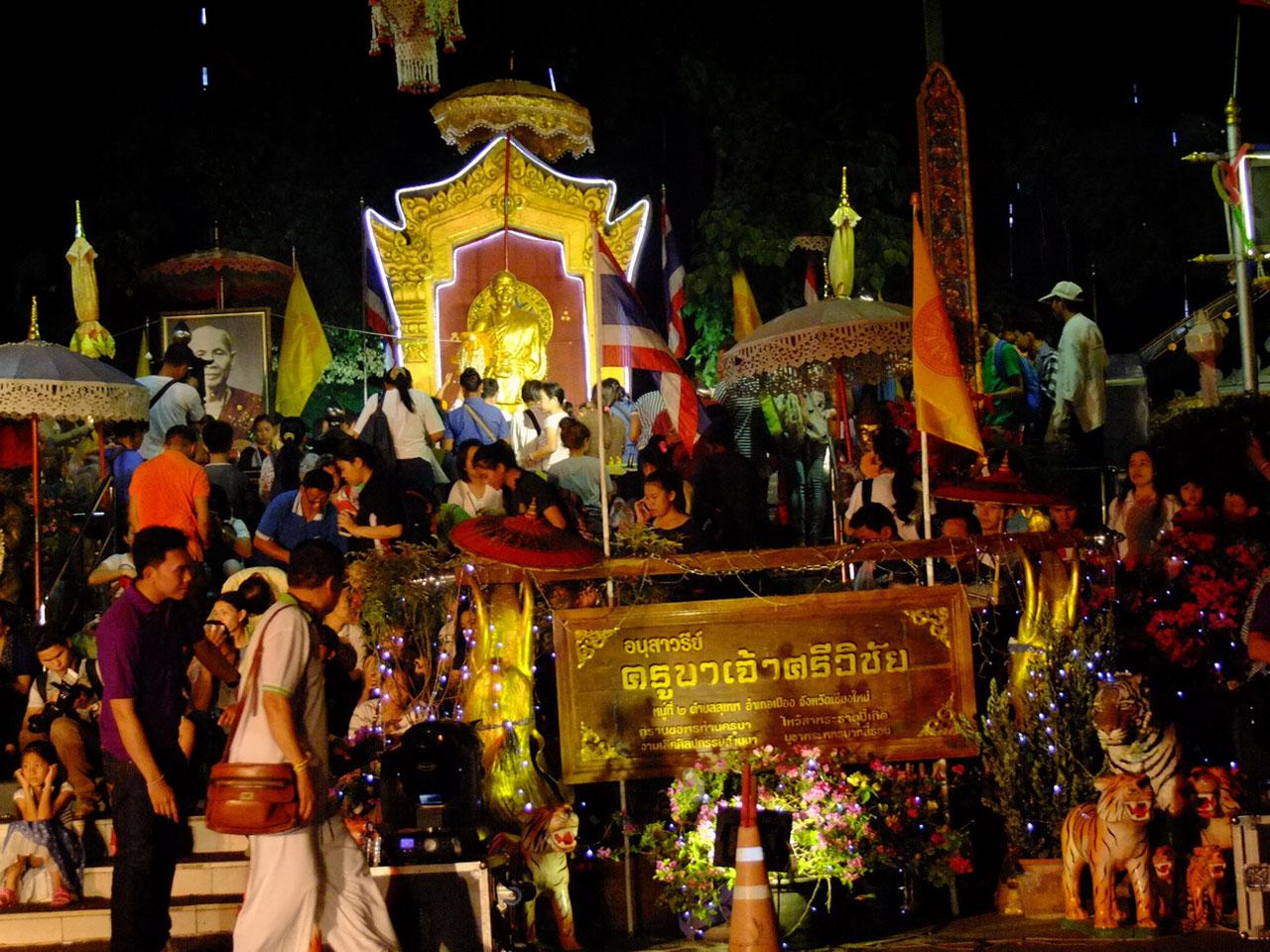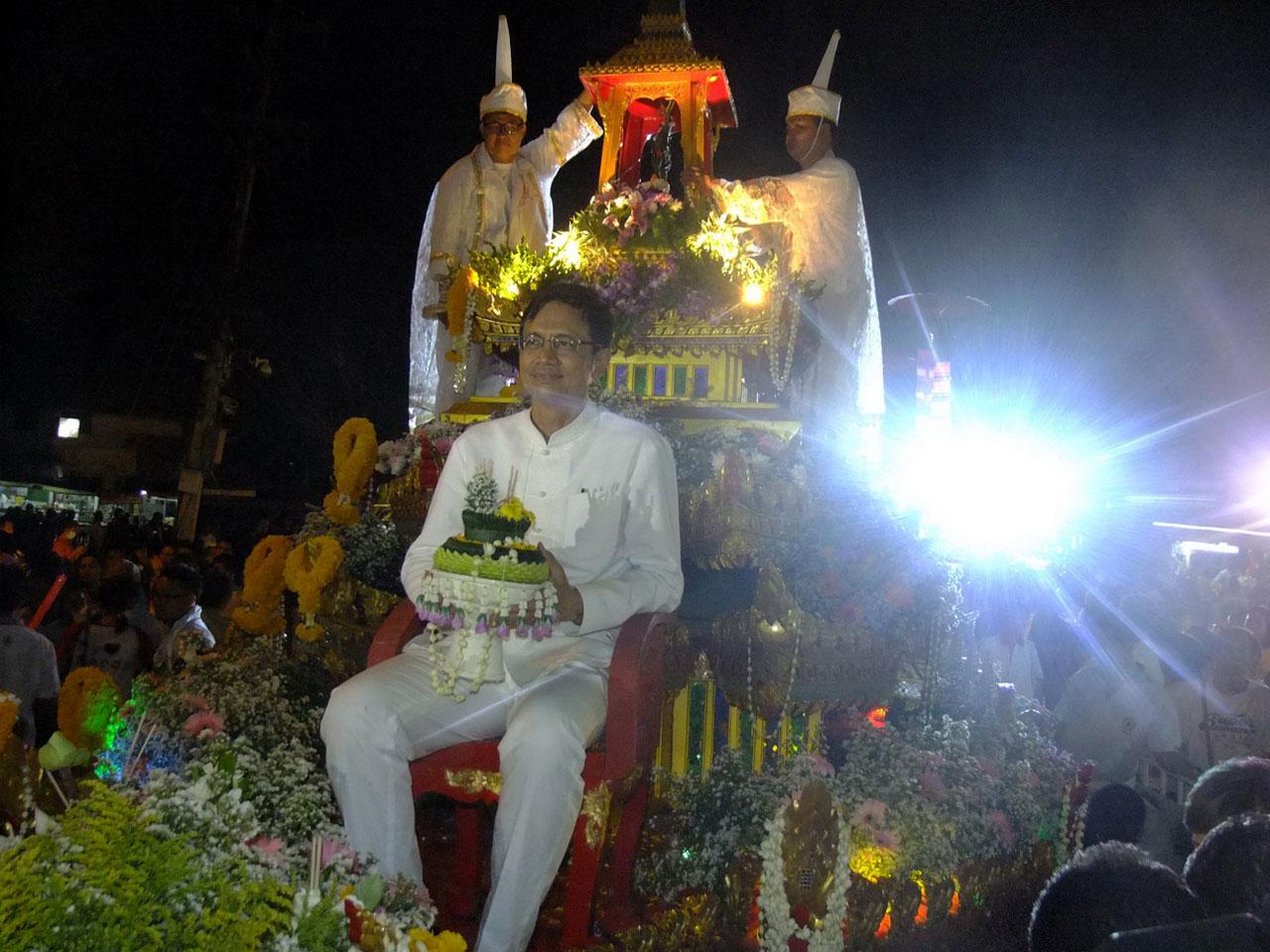 ต่อมา ในเวลา 20.30 น. นายปวิณ ทำพิธีเปิดเส้นทางเดินขึ้นดอย พร้อมกับขึ้นรถบุษบก อัญเชิญน้ำสรงพระราชทาน พร้อมถวายองค์พระบรมธาตุดอยสุเทพ ก่อนเคลื่อนขบวนขึ้นไปยังวัดพระธาตุดอยสุเทพ ตามประเพณีเตียวขึ้นดอย โดยรถบุษบกจะมีขบวนแห่เครื่องสักการะแบบล้านนา ตลอดเส้นทางจะจัดซุ้มต้อนรับและบริการ จำนวน 12 จุด บริการน้ำดื่ม โรงทานและพยาบาลประจำทุกจุด ตลอดเส้นทาง 11 กม. จากลานอนุสาวรีย์ครูบาศรีวิชัย จนถึงวัดพระธาตุดอยสุเทพ ตลอดเส้นทางจะมีริ้วขบวนของพุทธศาสนิกชนหัววัดต่างๆ จะเดินตลอดทั้งคืน จนขบวนแห่รถบุษบกถึงวัดพระธาตุดอยสุเทพ