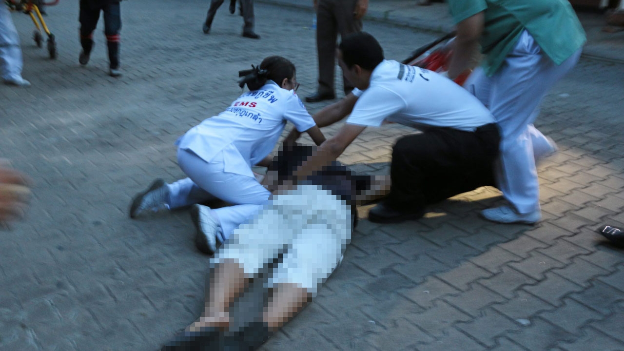 เจ้าหน้าที่หน่วยกู้ชีพปรี่เข้าไปที่ร่างของ ดร.วันชัย ดนัยตโมนุท เพื่อปฐมพยาบาลเบื้องต้น ก่อนส่ง รพ.ช่วยชีวิต หลังเครียดจัดยิงขมับตัวเองสมองกระจาย หนีความผิดในคดีฆ่า 2 ดร. แต่ยื้อไม่ไหวเสียชีวิตหลังถึง รพ.เปาโล ไม่นาน.