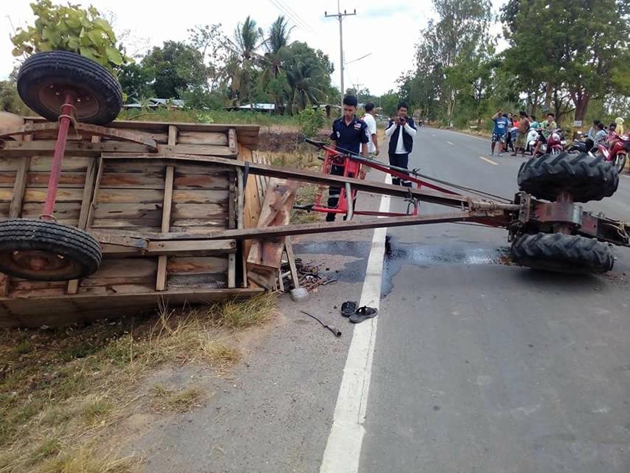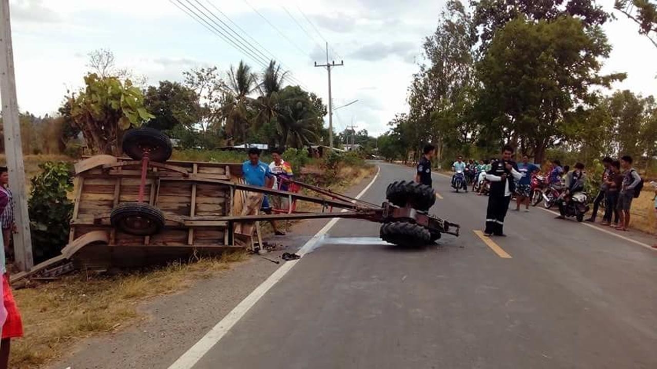 เมื่อวันที่ 20 พ.ค.59 พ.ต.ต.อนนท์ เรืองวงษ์ สว.สอบสวน สภ.พรานกระต่าย จ.กำแพงเพชร ได้รับแจ้งว่ามีรถอีแต๊กพลิกคว่ำทับคนขับอยู่ จึงประสานกู้ภัยสว่างพรานกระต่าย แพทย์เวร รพ.พรานกระต่าย และตำรวจจุดตรวจโกบัง รีบไปช่วยเหลือ ที่เกิดเหตุบนถนนสายพรานกระต่าย – โพธิ์พัฒนา บริเวณหมู่ 2 บ้านหนองตากล้า ต.ถ้ำกระต่ายทอง อ.พรานกระต่าย จ.กำแพงเพชร พบรถอีแต๊กพลิกคว่ำขวางถนนอยู่ ภายใต้รถอีแต๊กพบร่างของนายเกียว คำบรรลือ อายุ 53 ปี อยู่บ้านเลขที่ 25 หมู่ 9 บ้านใหม่โพธิ์พัฒนา ต.ถ้ำกระต่ายทอง อ.พรานกระต่าย ถูกตัวถังรถอีแต๊กทับที่คอ จึงให้กู้ภัยสว่างพรานกระต่าย ช่วยกันยกรถอีแต๊กออกแล้วนำร่างของนายเกียว ส่งรพ.พรานกระต่าย แพทย์ได้ช่วยปั๊มหัวใจอยู่ประมาณ 20 นาที แต่ก็ไม่สามารถยื้อชีวิตไว้ได้ เพราะว่าคนเจ็บขาดอากาศหายใจ และกรามหัก จึงเสียชีวิตในเวลาต่อมา