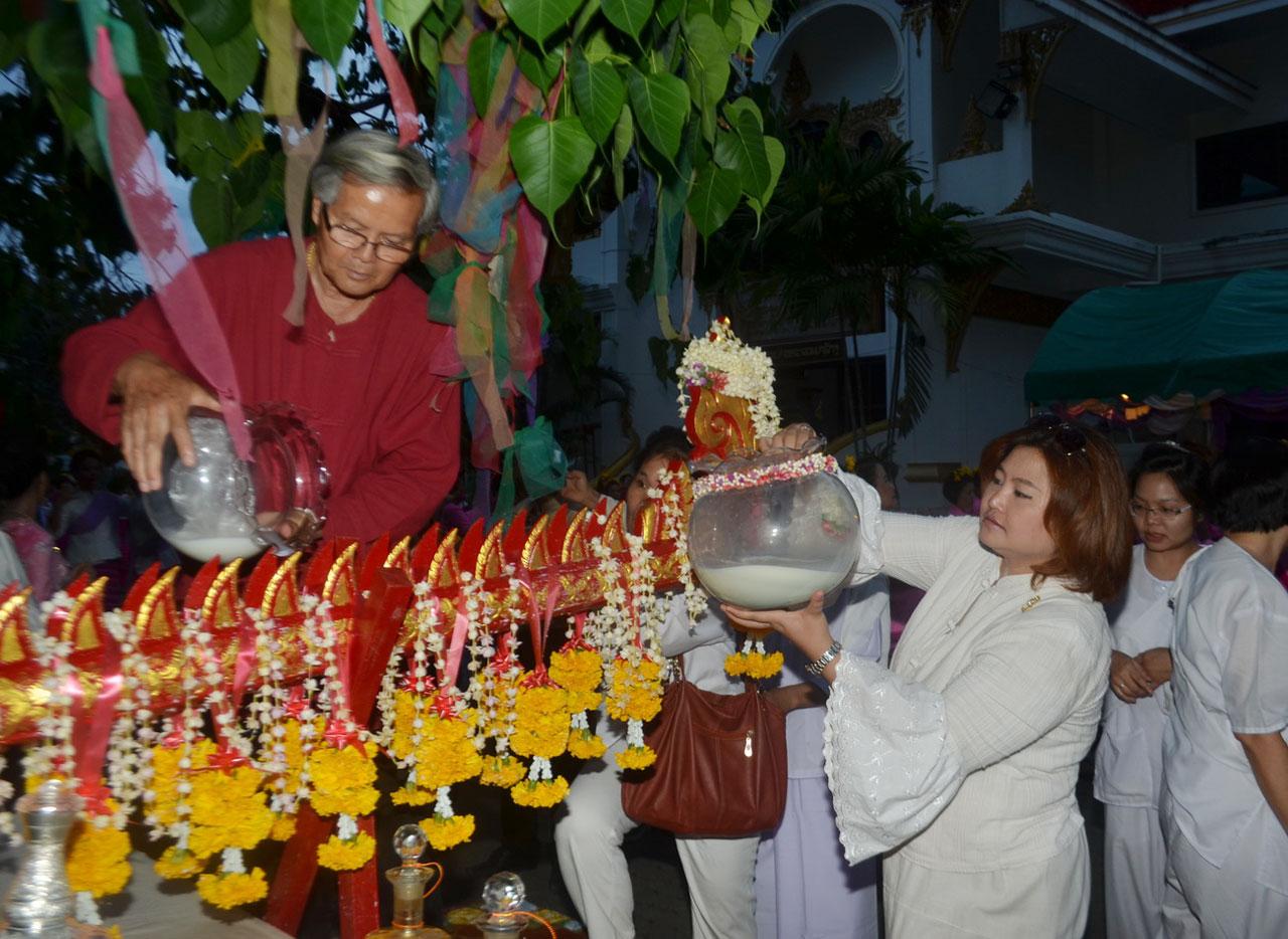 ต่อมา เมื่อเวลา 18.09 น. ผู้ว่าราชการจังหวัดเชียงใหม่ ทำพิธีถวายน้ำสรงพระราชทาน ประเพณีสรงน้ำพระธาตุเจดีย์ที่บรรจุพระเกศาธาตุของพระพุทธเจ้า โดยสรงน้ำลงในหงส์เงินเพื่อนำขึ้นสู่องค์พระธาตุ จากนั้น นำประชาชนถวายนมสดรดถวายต้นพระศรีมหาโพธิ์ ที่อัญเชิญมาจากประเทศอินเดีย และนำมาปลูกเมื่อปี พ.ศ. 2524 ซึ่งพิธีถวายนมสด มีการปฏิบัติเป็นประเพณีในวันวิสาขบูชา ทั้งนี้ ต้นพระศรีมหาโพธิ์ ถือว่าเป็นสถานที่ตรัสรู้ของพระพุทธเจ้า ชาว อ.ดอยสะเก็ด จึงสืบทอดประเพณีต่อกันมาในวันวิสาขบูชา ของทุกปี.