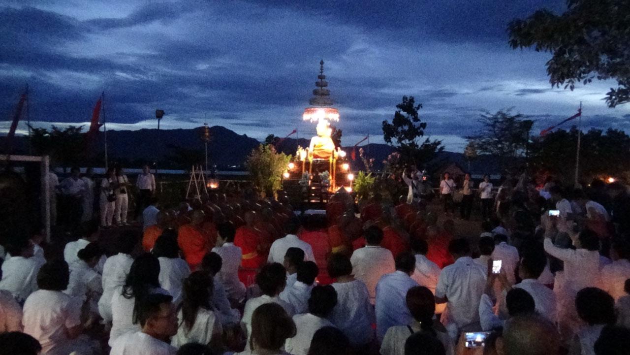 เมื่อเวลา 20.00 น. วันที่ 20 พ.ค. 59 พระครูโสภณปริยัติสุธี รองเจ้าคณะจังหวัดพะเยา พระครูอนุรักษ์ บุรานันท์ รองเจ้าคณะจังหวัดพะเยา เจ้าอาวาสวัดลี พร้อมด้วยคณะสงฆ์ใน จ.พะเยา จำนวน 39 รูป นายศุภชัย เอี่ยมสุวรรณ ผู้ว่าราชการจังหวัดพะเยา นายวรวิทย์ บุรณศิริ นายก อบจ.พะเยา หน้าส่วนราชการ ได้นำข้าราชการ ประชาชน และนักท่องเที่ยว ทั้งในและต่างจังหวัด กว่า 5,000 คน เดินเท้าข้าม “ขัวบุญ” หรือ สะพานบุญไม้ไผ่ จากบริเวณท่าเรือวัดติโลกอาราม เพื่อเข้าสักการะหลวงพ่อศิลากว๊านพะเยา อายุกว่า 500 ปี ก่อนจะประกอบพิธีเวียนเทียนทางน้ำ รอบวัดติโลกอารามกลางกว๊านพะเยา หนึ่งเดียวในโลก ที่ จ.พะเยา ร่วมกับหน่วยงานที่เกี่ยวข้องจัดขึ้นเนื่องในวันวิสาขบูชา