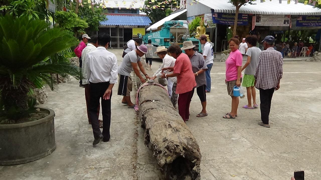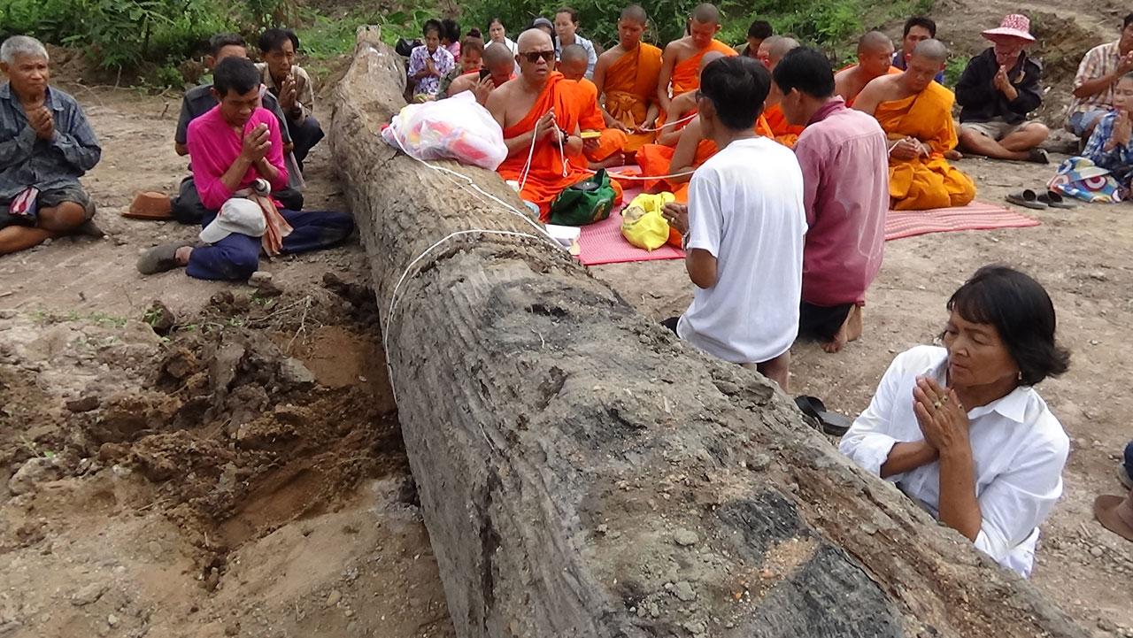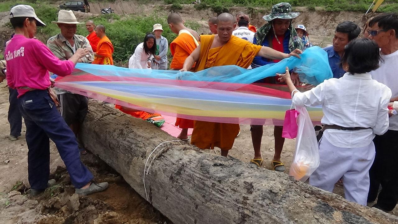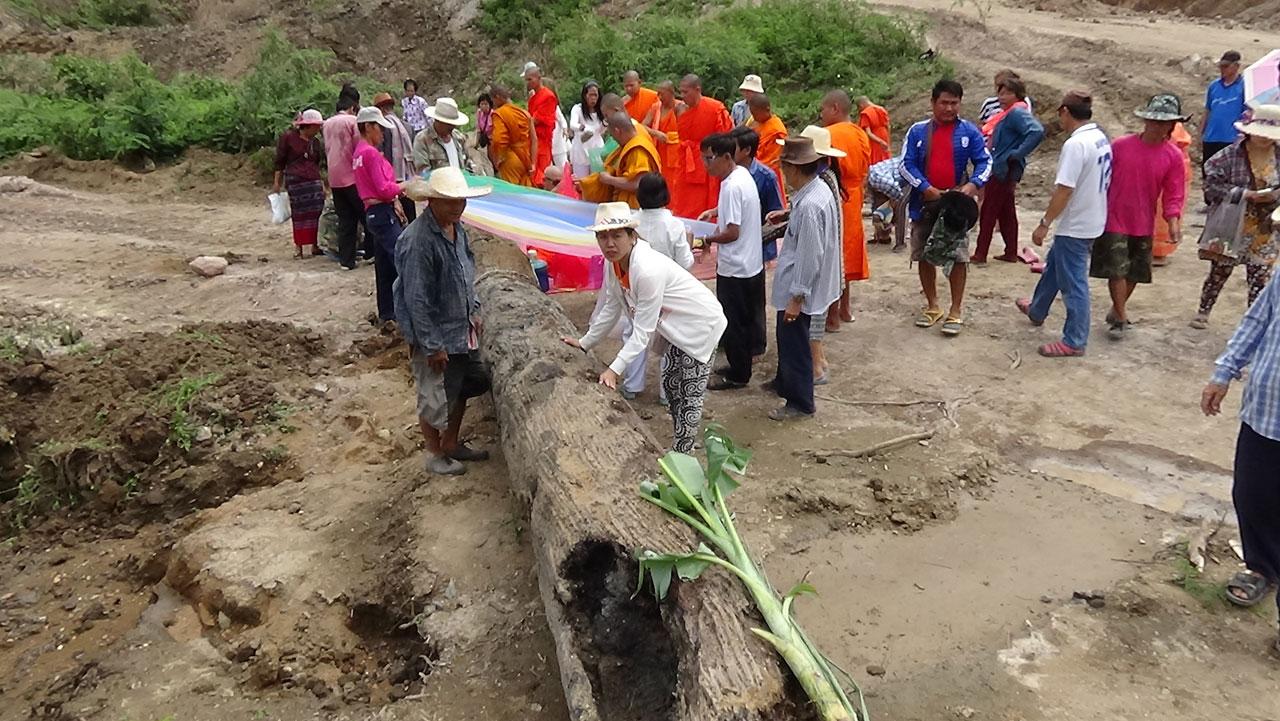 จากการเปิดเผยของพระครูวิธานนิมมานกิจ (ครูบาบุญช่วย) ทราบว่า ก่อนจะมีการพบต้นตะเคียนทองได้ฝันเห็นชายรูปร่างสูงใหญ่มาเข้าฝัน และบอกคาถาให้ถ่องให้ได้ และประตูถ้ำจะเปิด เมื่อท่องถาคาได้ ต่อมาวันที่ 16 พ.ค.59 เวลาบ่าย ได้มีการขุดลอกอ่างเก็บน้ำป่าซาง เมื่อรถแบ็กโฮขุดดินในอ่างลงลึกประมาณ 4 เมตร ก็พบท่อนไม้ตะเคียนทองยาว 16 เมตร กว้าง 1.50 เมตร วางขวางอยู่ปากถ้ำ รถแบ็กโฮจึงขุดขึ้นมาไว้ข้างบน จนกระทั่งทางพระและชาวบ้านได้ร่วมแรงร่วมใจกันทำพิธีบวงสรวงและขอเอามาเก็บไว้ในวัดศรีเมืองมูล ตามความฝัน และเชื่อว่าความฝันเป็นจริง ชายที่รูปร่างสูงใหญ่ดำ ต้องเป็นต้นตะเคียนทองอย่างแน่นอน และขณะที่เคลื่อนย้ายทำพิธีขนย้ายก็เคลื่อนง่ายมากไม่ติดขัดอะไร ทั้งที่ก่อนหน้านั้นได้มีชาวบ้านช่วยกันขนย้าย แต่ก็ไม่สามารถเคลื่อนย้ายออกมาได้ทั้งที่ขนขึ้นรถแล้ว จนทางพระและชาวบ้านทำพิธี จึงทำการขนย้ายขึ้นรถเทรลเลอร์ที่ทางนายวรวิทย์ บุรณศิริ นายก อบจ.พะเยา ให้การสนับสนุน มาทำการเคลื่อนย้ายมาเก็บไว้ที่วัดได้สะดวก และที่น่าแปลก คือ ขณะทำพิธีได้เกิดท้องฟ้ามืดไม่มีแสงแดดสาดส่องแต่อย่างใด อากาศมืดครึ้ม สร้างความประหลาดใจแก่ผู้คนที่มาร่วมพิธี และการขุดค้นพบต้นตะเคียนทองต้นนี้ ถือว่าเป็นการขุดค้นพบเป็นต้นแรกของอำเภอดอกคำใต้