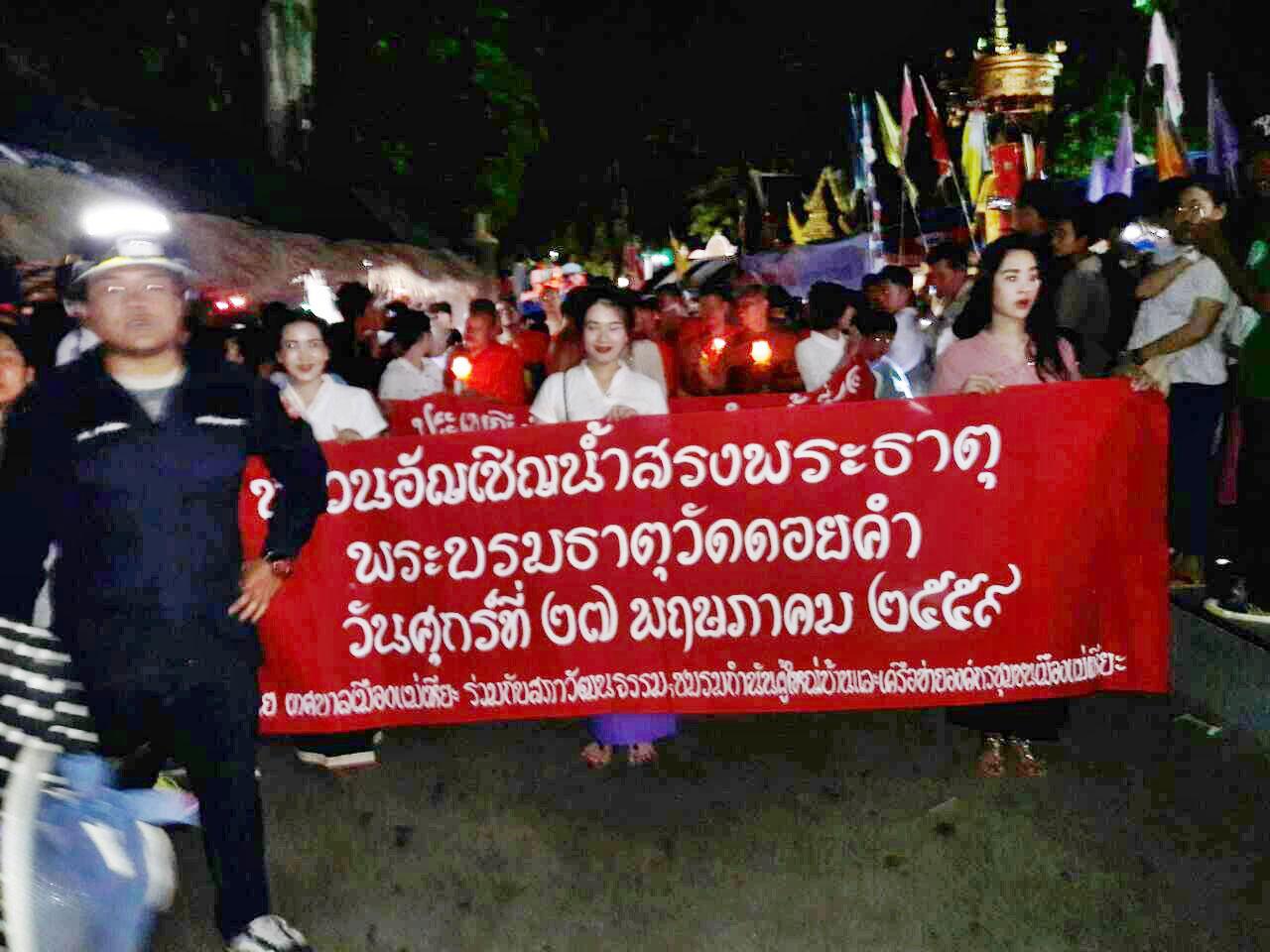 เมื่อเวลา 19.30 น. วันที่ 27 พ.ค. 59 ซึ่งตรงแรม 7 ค่ำ เดือน 8 ที่วัดพระธาตุดอยคำ ต.แม่เหียะ อ.เมืองเชียงใหม่ มีพิธีแห่น้ำสรงพระธาตุ ที่ พระเจ้าวรวงศ์เธอ พระองค์เจ้าโสมสวลี พระวรราชาทินัดดามาตุ ทรงประทาน โดยมี นายบุญเลิศ บูรณุปกรณ์ นายก อบจ.เชียงใหม่ เป็นประธานในพิธี นายธนวัฒน์ ยอดใจ นายกเทศมนตรีเมืองแม่เหียะ ชมรมกำนันผู้ใหญ่บ้าน พุทธศาสนิกชนทั่วทุกสารทิศนับหมื่นคน ร่วมกันอัญเชิญน้ำสรงพระราชทานขึ้นสู่วัดพระธาตุดอยคำ
