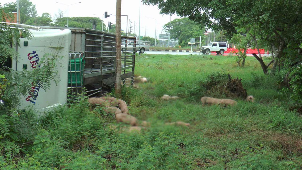 เมื่อวันที่ 31 พ.ค. 2559 ร.ต.อ.วุฒิชัย ชูรัตนสุภนนท์ รอง สว.สอบสวน สภ.เมืองแพร่ อ.เมือง จ.แพร่ ได้รับแจ้งว่าเกิดอุบัติเหตุรถบรรทุกหมูพลิกคว่ำบริเวณถนนสายเลี่ยงเมือง กม.ที่ 3 หมู่ที่ 9 ต.นาจักร อ.เมือง จ.แพร่ หลังจากได้รับแจ้งแล้วจึงได้ไปสอบสวนที่เกิดเหตุ บริเวณที่เกิดเหตุเลยจากสามแยกเข้าตัวเมืองแพร่ประมาณ 10 เมตร พบรถบรรทุกทะเบียน 86-0908 ชลบุรี พลิกตะแคงลงข้างทาง พบมีหมูตัวขนาด 25 กก. จำนวนมากนอนตายเกลื่อน บางตัวก็ยังเดินไปไม่ได้ บางตัวตกใจวิ่งหนีเข้าไปในร้านอาหารแก้ววรรณาที่อยู่ข้างทาง