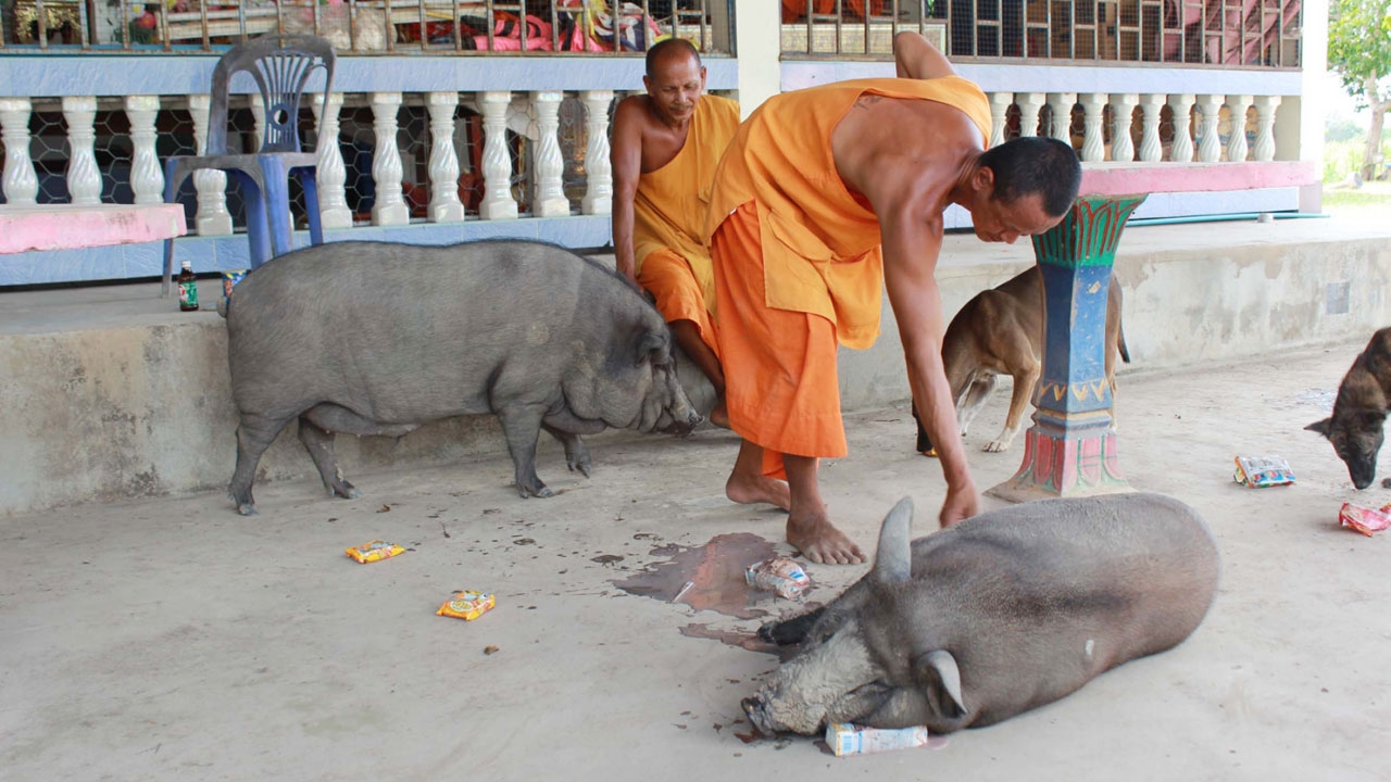 พระปาน เปิดเผยว่า หมูตัวโตชื่อ ช้าง อายุ 1 ปี และ ตัวเล็กชื่อ กระแต อายุ 4 เดือน เพศผู้ทั้ง 2 ตัว โดยเมื่อเล็กๆ ได้ไปบิณฑบาต และเห็นเจ้าของกำลังจะเอาไปทุบเพื่อทำเป็นอาหาร จึงขอบิณฑบาตไถ่ชีวิตมาทั้ง 2 ตัวแล้วนำมาเลี้ยงไว้ที่วัด