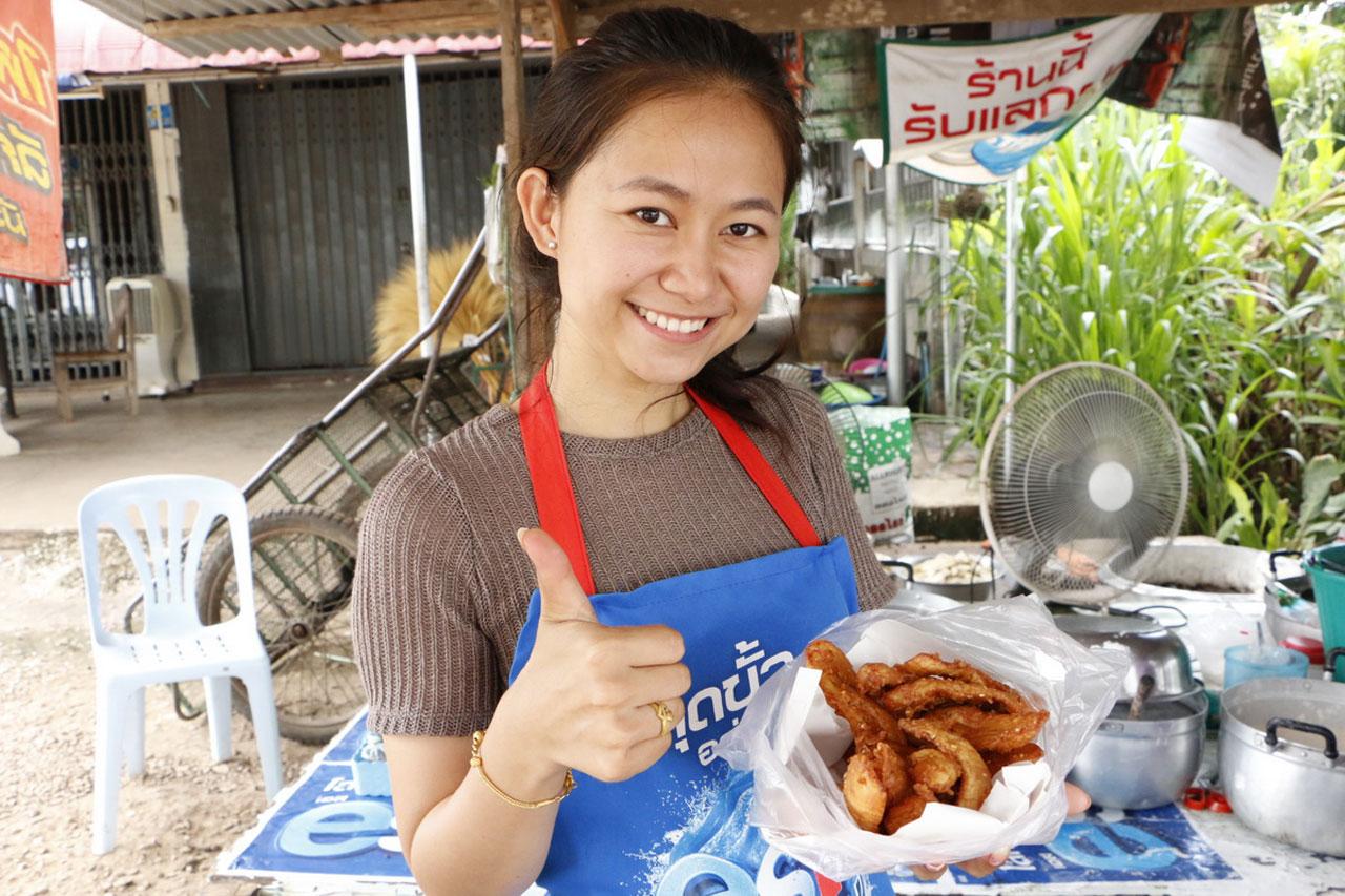 ทั้งนี้ ร้านของน้องกาวมีทั้งกล้วยทอด เผือกทอด ฝักทองทอด เต้าหู้ทอด เป็นที่ขึ้นชื่อว่าร้านนี้อร่อยทุกอย่างจนทอดไม่ทันขาย ลูกค้าบางรายต้องสั่งไว้ก่อนแล้วค่อยกลับมารับ บางรายยอมยืนรอนั่งรอแม้จะเสียเวลาเกือบชั่วโมงก็ตาม โดยเฉพาะหนุ่มๆ มาเข้าคิวซื้อ พร้อมยืนดูน้องกาวไปด้วย เพราะความเป็นคนพูดเก่ง พูดเพราะ เอาใจลูกค้า จากการสังเกตดู แต่ละคนซื้อขั้นต่ำ 60 บาทไปจนถึง 100 บาท