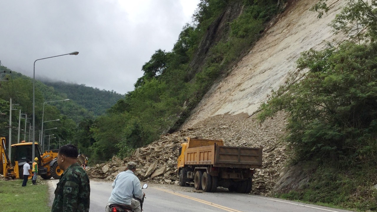 ฝนที่ตกต่อเนื่อง ในพื้นที่ อ.หล่มสัก จ.เพชรบูรณ์ ทำให้ดินและหินบนเขาสไลด์ลงมาทับเส้นทางใกล้สะพานห้วยตอง ที่มีรถตกเหวตายหมดคัน29ศพเมื่อหลายปีก่อน เดชะบุญตอนถล่มไม่มีรถวิ่งผ่าน จนท.ต้องเร่งทำงานกลางสายฝน เพื่อเปิดเส้นทาง...