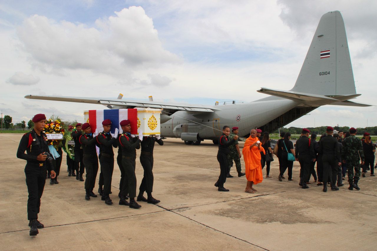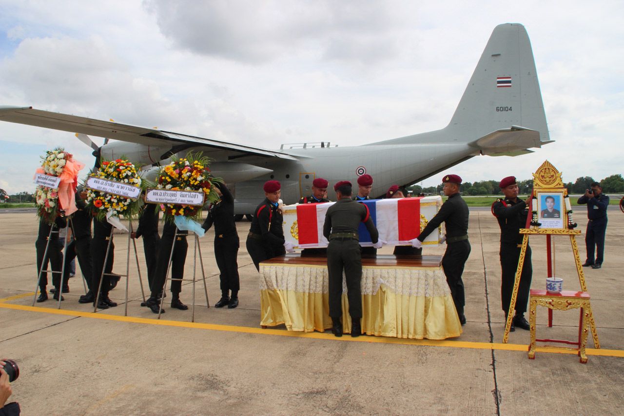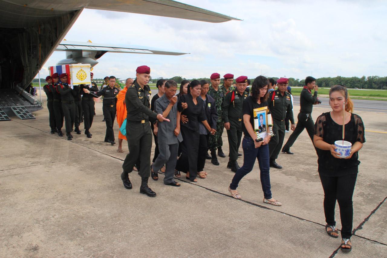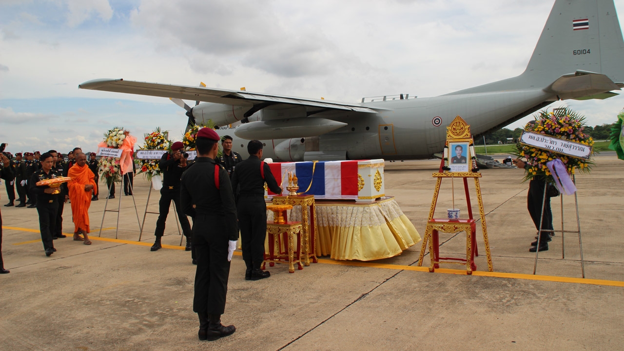 ส่งศพ จ.ส.อ.รบพิเศษ กลับสู่บ้านเกิดที่ จ.พิษณุโลก หลังพลีชีพจากเหตุลอบวางระเบิดหน้าโรงเรียน อ.ระแงะ จ.นราธิวาส ซี130 บินลงที่กองบิน 46 ผู้บังคับบัญชาจัดกองทหารเกียรติยศตั้งแถวรอรับอย่างสมเกียรติ...