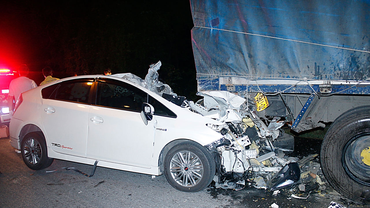 หนุ่ม กทม. ขับเก๋งพาแม่และแฟนสาวไปเยี่ยมญาติที่ จ.แพร่ มาถึงอุตรดิตถ์ พุ่งชนท้ายรถสิบล้อจอดริมถนน รถอัดติดใต้ท้องสภาพยับเยิน แม่ถูกอัดก๊อบปี้ โครงเหล็กบาดเสียชีวิต ส่วนคนขับ-แฟน บาดเจ็บ