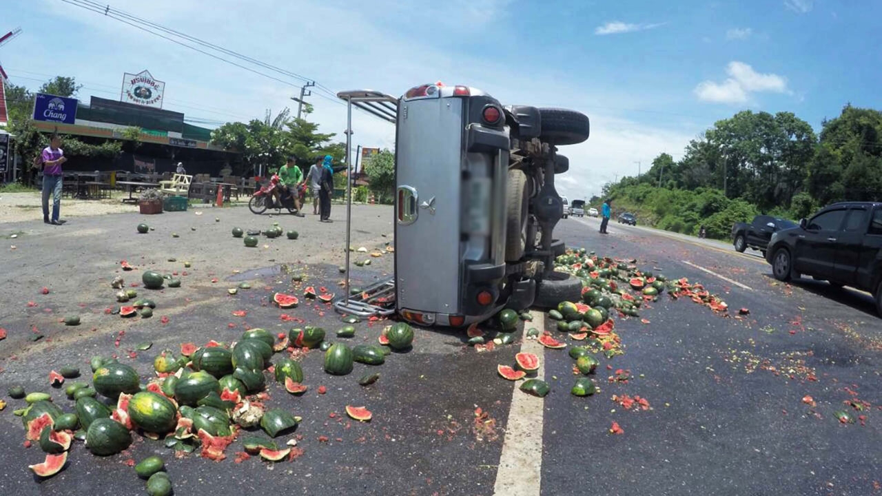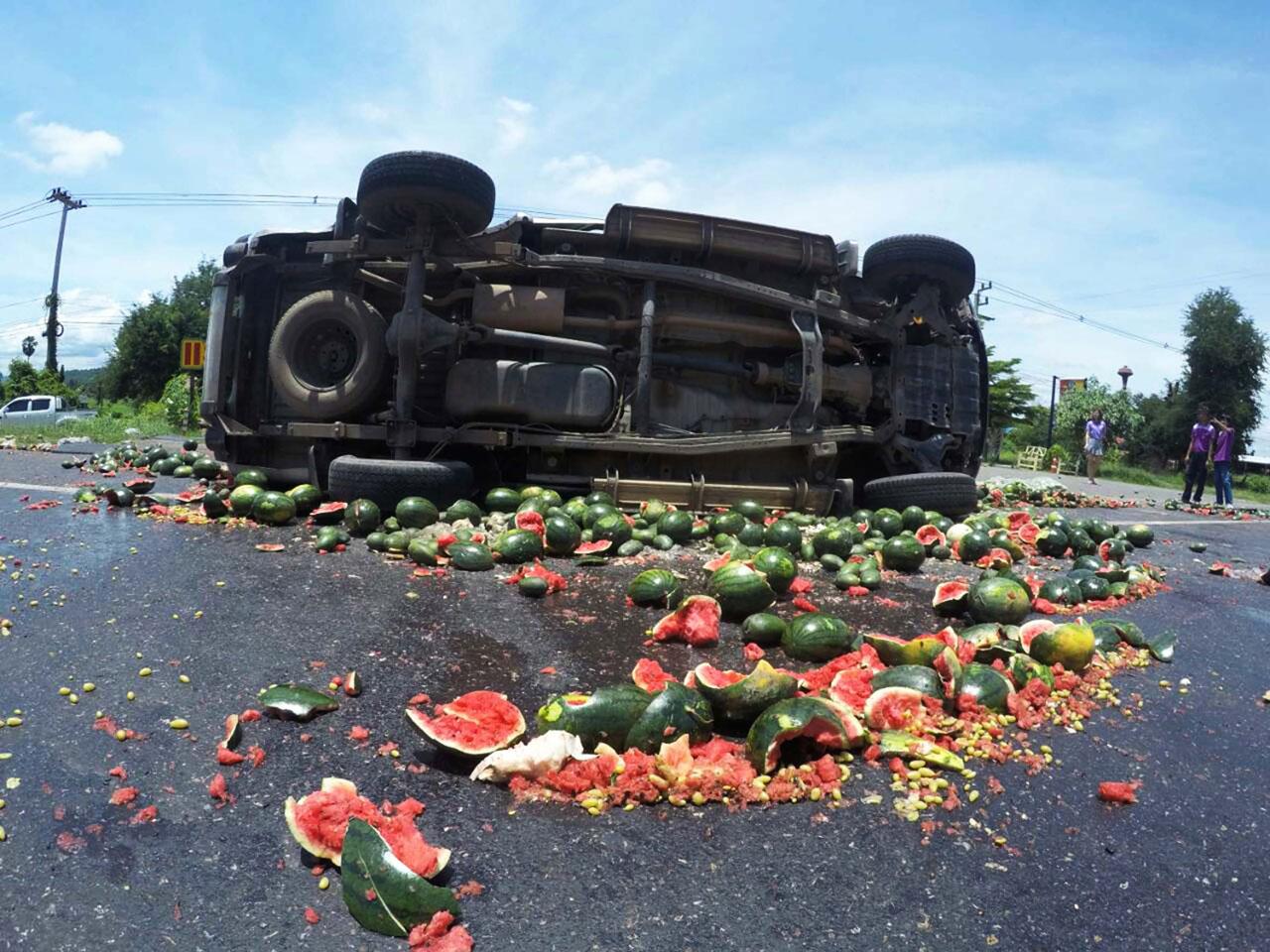 เกิดอุบัติเหตุพ่อค้าผลไม้ ควบกระบะ รับผลไม้มาจากตลาดผลไม้ ต.ดอนทอง อ.เมืองพิษณุโลก เพื่อไปขายที่ จ.เลย เกิดยางแตก พลิกคว่ำ 2 ตลบ ผลไม้หล่นแตกเกลื่อนถนน ทั้ง แตงโม - แคนตาลูป โชคดีไม่มีผู้ใดได้รับบาดเจ็บ
