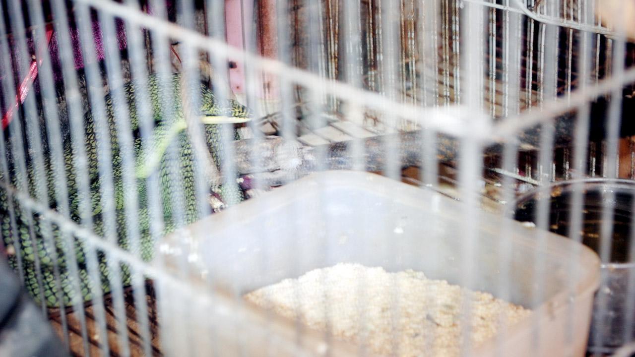 สาวใหญ่สวรรคโลก แปลกใจ นกหงส์หยกร้องดังผิดปกติ ออกจากบ้านมาดู ผงะ งูเขียวยาวเมตรกว่า เลื้อยเข้ากรงกินไป 2 ตัว เหลืออีกตัวพยายามบินหนี โร่แจ้ง จนท. ช่วยจับ