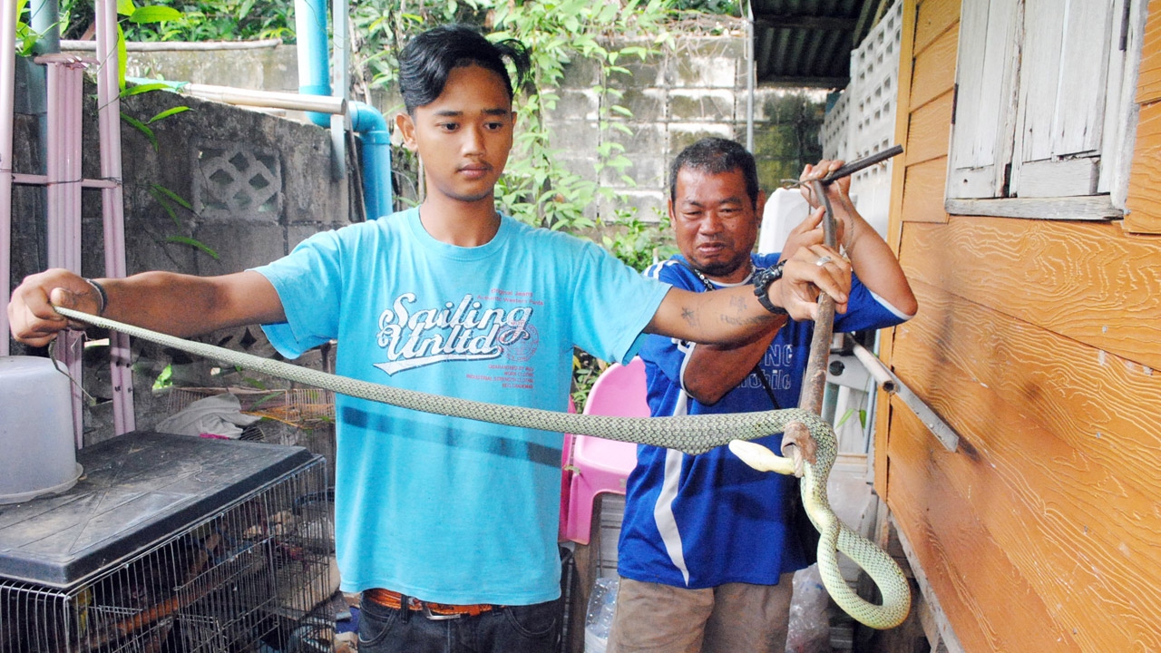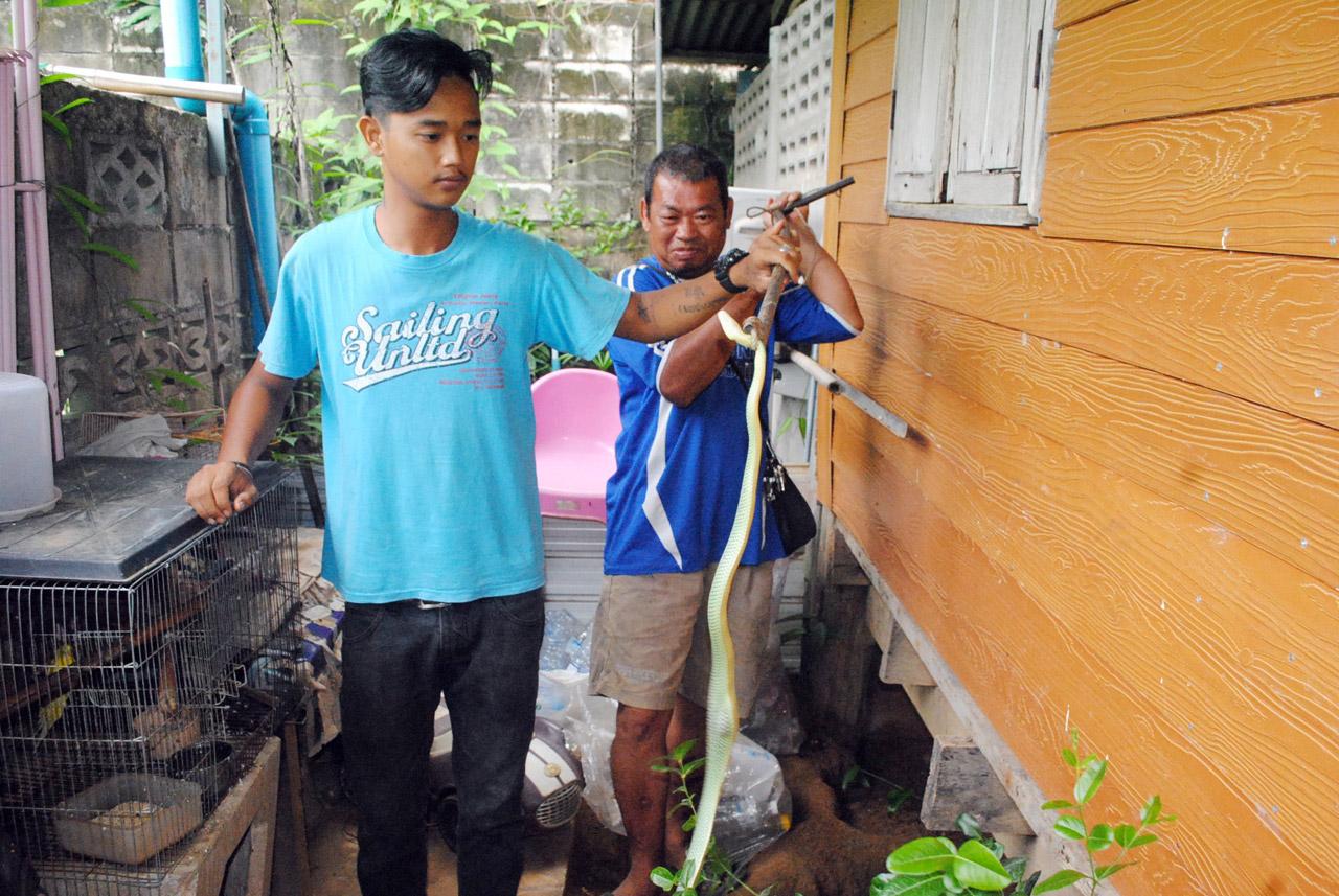 ที่บ้านดังกล่าวเจ้าหน้าที่พบงูเขียวตัวใหญ่ ยาวประมาณ 1 เมตรกว่า เลื้อยอยู่ในกรงนกหงส์หยก ที่วางอยู่ริมรั้วด้านข้างบ้าน ที่ท้องงูป่องออกมาเนื่องจากกินนกหงส์หยกเข้าไป ในกรงจึงเหลือนกหงส์หยก เพียงตัวเดียวที่กำลังพยายามบินหนีเพื่อไม่ให้ถูกกิน เจ้าหน้าที่จึงได้ใช้เชือกคล้องที่หัวงูเขียว ก่อนจับออกมาใส่กระสอบปุ๋ยได้สำเร็จ