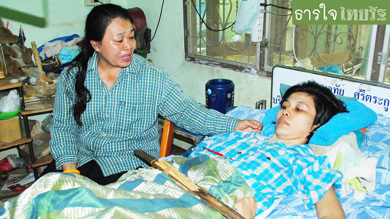 พบกับ นางวาสนา ทรัพย์สิน อายุ 58 ปี กำลังใช้ผ้าขนหนูชุบน้ำอุ่นเช็ดเนื้อตัวให้กับ "น้องจอย" น.ส.นภาภรณ์ ทรัพย์สิน อายุ 32 ปี บุตรสาว ซึ่งต้องนอนทนทุกข์ทรมานอยู่บนเตียงคนไข้มานานถึง 18 ปี อย่างทะนุถนอมด้วยความรัก อีกทั้งยังพยายามพูดคุยกับบุตรสาวด้วยถ้อยคำอ่อนโยน สังเกตเห็นมีน้ำตาคลอเบ้าอยู่ตลอดเวลา นางวาสนาเล่าว่า"น้องจอย"ประสบอุบัติเหตุทางรถยนต์ตั้งแต่ปี พ.ศ.2541 ขณะที่กำลังเรียนอยู่ชั้น ม.4 โรงเรียนอุดมดรุณี ในตัวเมือง ซึ่งมีอายุเพียง 14 ปีเท่านั้น