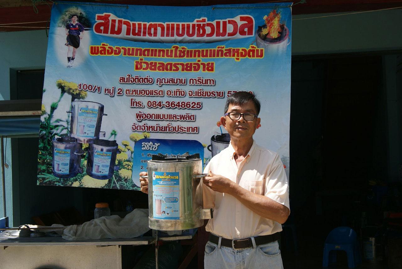 เมื่อวันที่ 10 ส.ค. 59 นายสมาน การรินทา อายุ 59 ปี กล่าวว่า ตนเองจบการศึกษาระดับ ม.6 จากศูนย์การศึกษานอกโรงเรียน อ.เทิง และตนเองประกอบอาชีพเกษตรกร โดยเริ่มมาขายน้ำเต้าหู้เมื่อประมาณปี 2552 เป็นอาชีพเสริม ตอนนั้นใช้แก๊สหุงต้มในการต้มน้ำเต้าหู้ พบว่าสิ้นเปลืองมากเพราะแก๊ส 1 ถังจะใช้ได้ประมาณ 1 อาทิตย์ จึงพยายามคิดหาสิ่งที่จะมาใช้ทดแทนแก๊สหุงต้ม และนึกถึงแก๊สชีวมวลขึ้นมาเพราะเป็นแนวคิดที่ตนคิดมานานแล้ว จึงได้พยายามคิดค้นต่อยอดจากความคิดที่ค้างคามาหลายปี ลองผิดลองถูกพัฒนามากว่า 5 ปี จนออกมาเป็นรูปแบบในปัจจุบัน