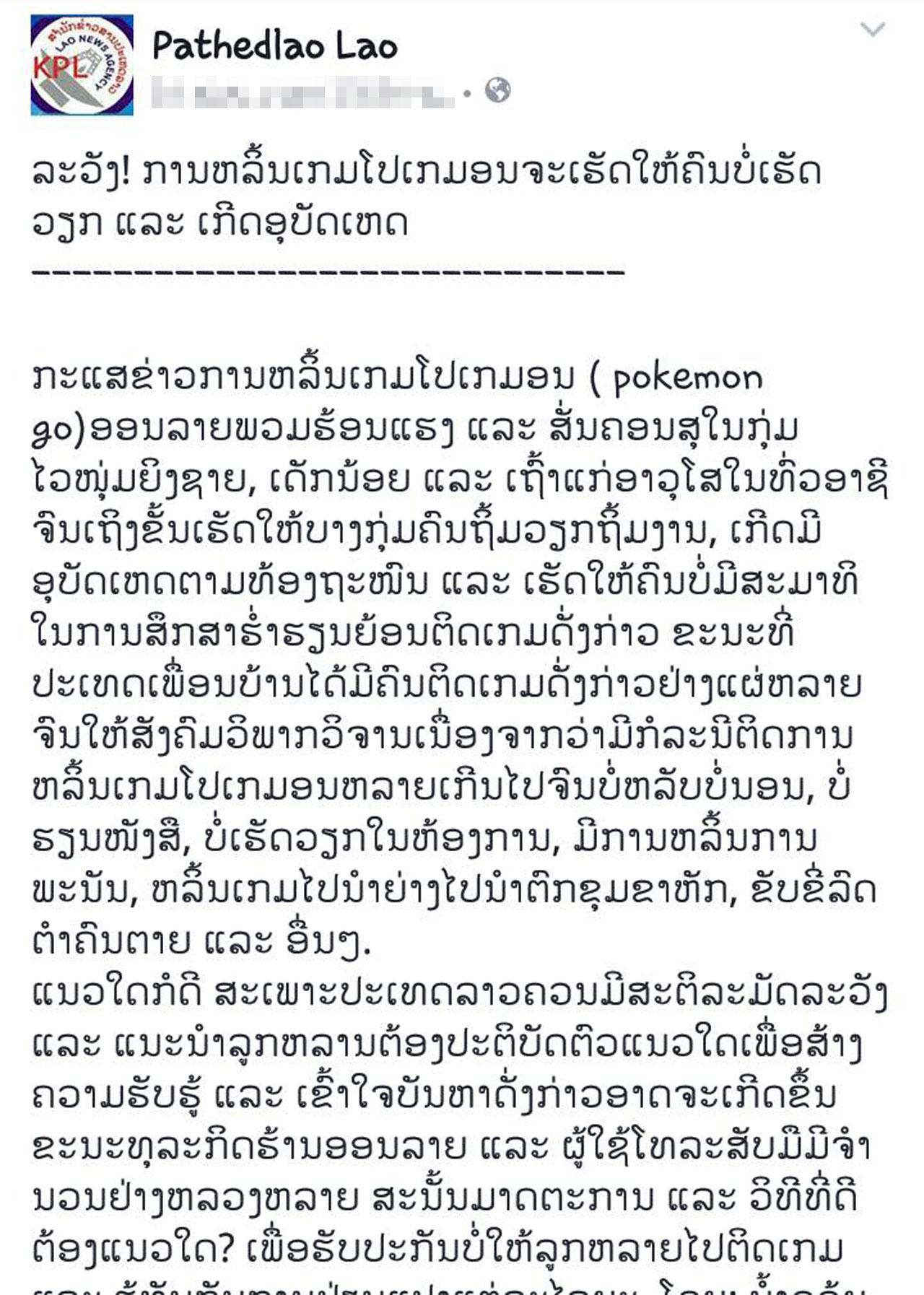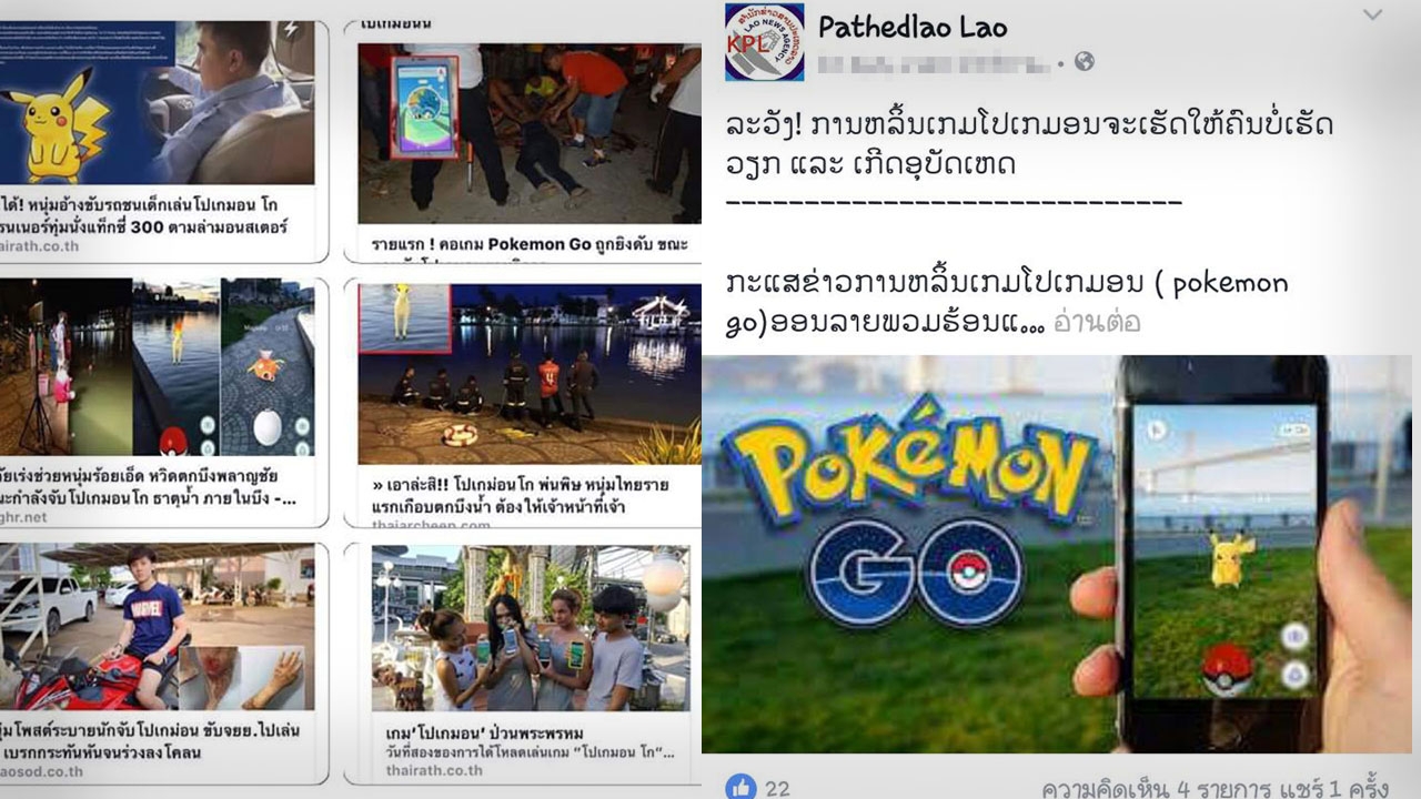 วันที่ 11 ส.ค.59 ผู้สื่อข่าวรายงานจากชายแดนติดแม่น้ำโขง ด้านจ.เชียงราย ว่า เฟซบุ๊กสำนักข่าวสารประเทศลาว ได้โพสต์เตือนให้ดูเหตุการณ์ในไทยให้เป็นอุทาหรณ์กับคนลาว ในเรื่องกระแสของเกมฮิต โปเกมอน โก ข้อความว่า