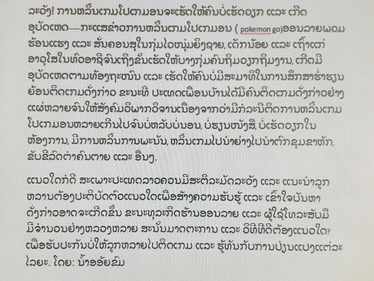 กระแสโปเกมอน โก ข้ามโขงไปถึงลาวแล้ว จนเฟซบุ๊กสำนักข่าวสารฯ ต้องโพสต์เตือนประชาชนให้ระวังในการเล่นเกม ยกตัวอย่างในไทยเป็นอุทาหรณ์ เหตุเพราะคนลาวตามแนวชายแดนที่ใช้สมาร์ทโฟน สามารถรับสัญญาณเครือข่ายของไทยได้...