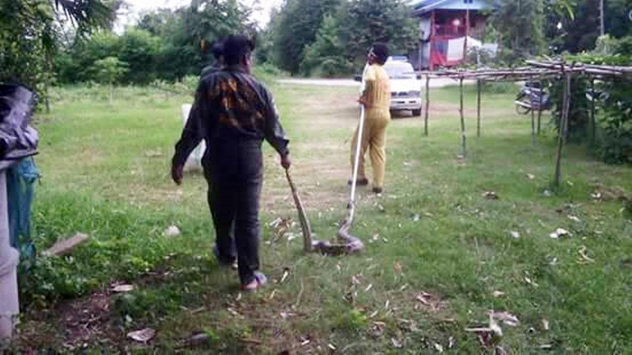 จากนั้นไม่นาน นายนรินทร์ พร้อมเจ้าหน้าที่ 3 คน ได้รุดไปถึง พบนางสมพร ค้อมทอง อายุ 50 ปี เจ้าของบ้าน ยืนรออยู่ พร้อมกับชี้ให้ดูภายในเล้าไก่พันธุ์พื้นเมืองที่อยู่ข้างบ้าน บอกว่าตื่นเช้ามาก็ต้องตกใจ เมื่อพบงูหลามขนาดใหญ่ยาว 3 เมตร หนักประมาณ 15-20 กก. นอนพุงกางขดตัวอยู่ในเล้าไก่ ส่วนไก่ที่เคยอยู่ในเล้ากลับหายไป ทางกู้ภัยจึงใช้อุปกรณ์ช่วยกันจับออกมาโดยง่าย เนื่องจากงูเพิ่งกินอิ่มจนพุงกาง และไม่ยอมเลื้อยหนีไปไหน