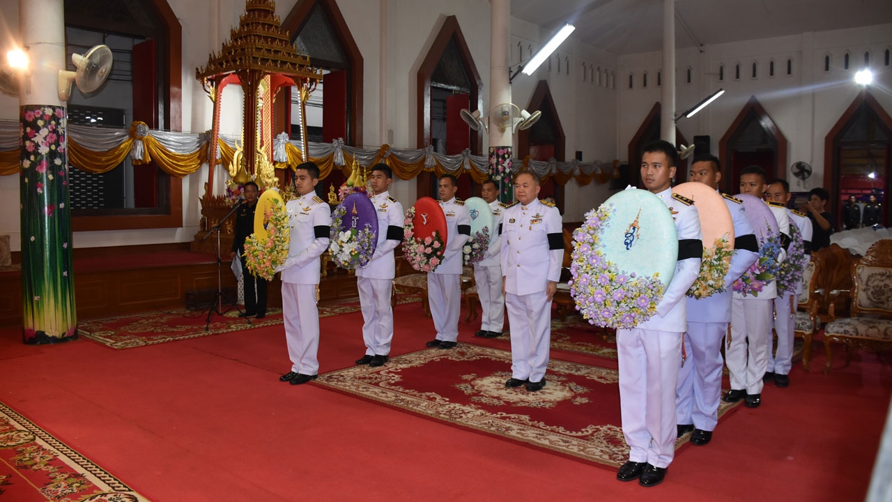 รองผู้ว่าฯ พิษณุโลก 3 คน อัญเชิญพวงมาลาพระราชทาน "ในหลวง พระราชินี พระบรมวงศานุวงศ์" วางหน้าหีบศพ "พล.ท.สุทัน พ.ท.ชัยศักดิ์ดา ร.อ.มงคลชัย" 3 ใน 5 ทหารกล้า ฮ.ตก