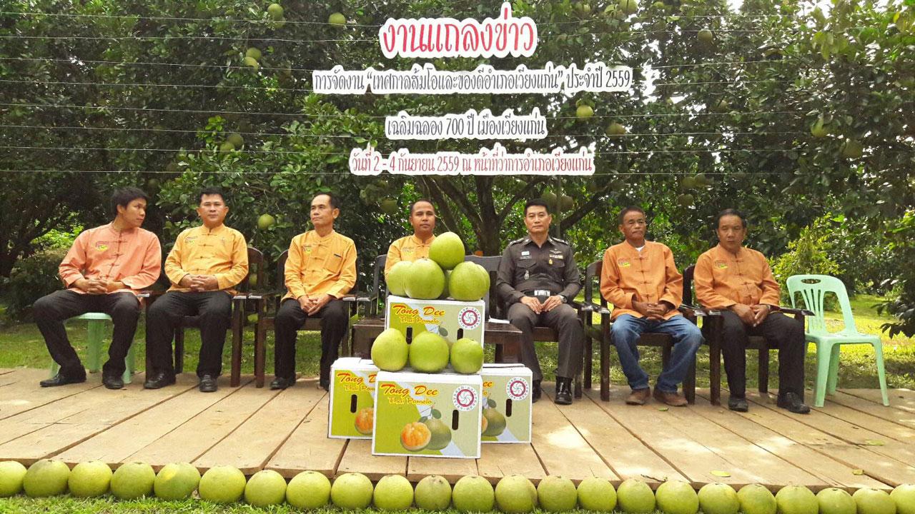 เมื่อวันที่ 26 ส.ค. 59 นายชำนาญ สรรพลิขิต ปลัดอำเภอรักษาราชการแทนนายอำเภอเวียงแก่น นำส่วนราชการ รัฐวิสาหกิจ กำนัน ผู้ใหญ่บ้าน องค์การปกครองท้องถิ่น ผู้ประกอบการสวนส้มโอเวียงแก่น จ.เชียงราย ร่วมกันแถลงเปิดงาน 'เทศกาลส้มโอและของดีอำเภอเวียงแก่น ประจำปี 2559' ระหว่างวันที่ 2-4 ก.ย. 59 ที่สนามหน้าที่ว่าการอำเภอเวียงแก่น
