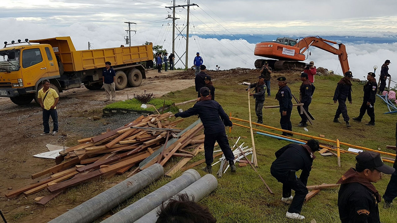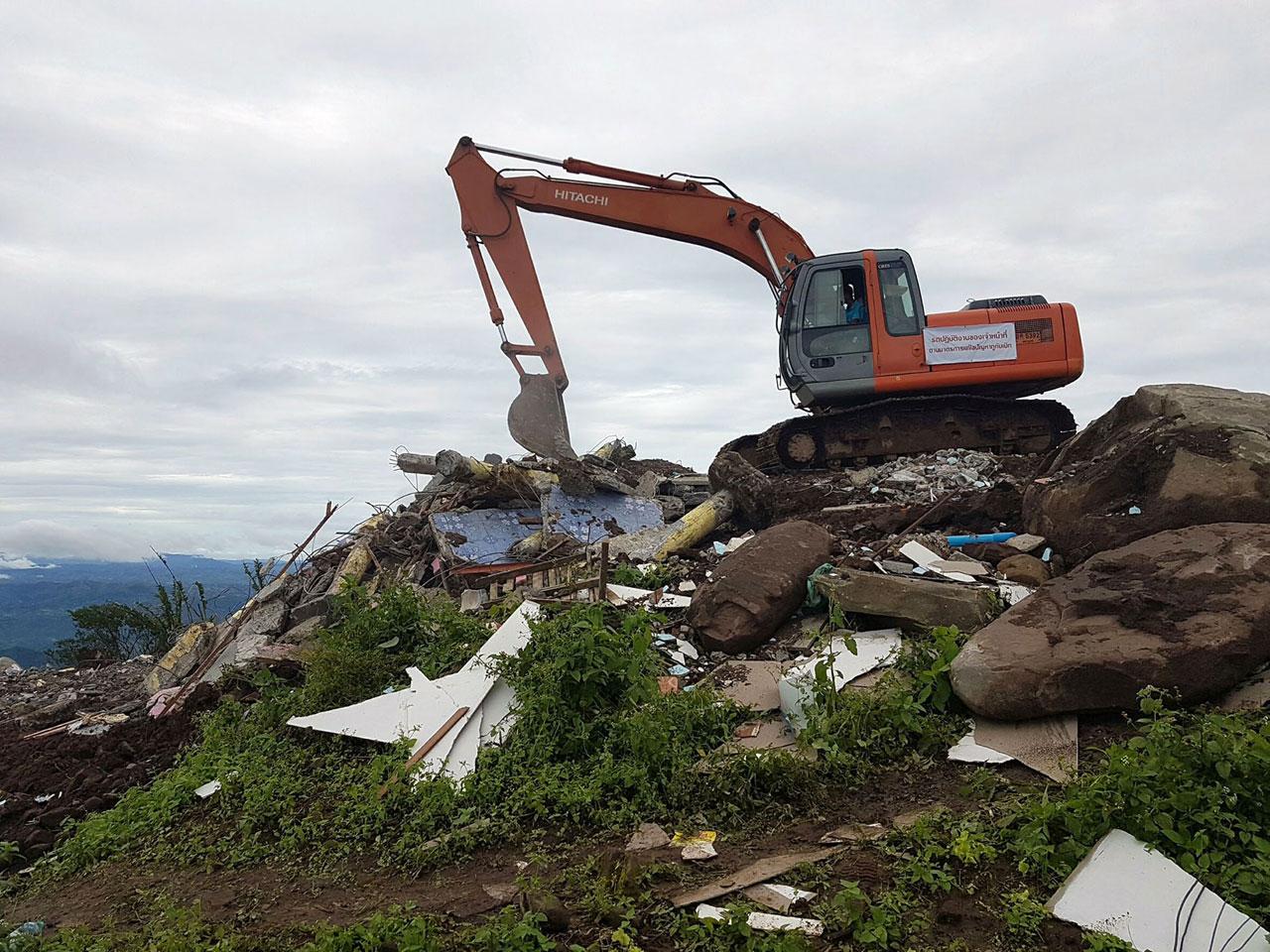 เมื่อวันที่ 31 ส.ค. 59 ความคืบหน้าการสนธิกำลังของเจ้าหน้าที่ปกครองเจ้าหน้าที่ป่าไม้และเจ้าหน้าที่ตำรวจกว่า 400 นายเข้ารื้อถอนรีสอร์ตภูทองคำและสายหมอกรีสอร์ทซึ่งเป็นรีสอร์ตในจำนวน 19 ราย บนยอดดอยภูทับเบิก ต.วังบาล อำเภอหล่มเก่า จังหวัดเพชรบูรณ์ที่ถูกศาลมีคำพิพากษาและคำสั่ง คสช.ที่ 35/2559 ให้ออกจากพื้นที่และทำการรื้อถอนสิ่งปลูกสร้าง โดยในช่วงเช้าวันนี้ได้มีการจัดกำลังเจ้าหน้าที่เข้าตรวจสอบหาวัตถุระเบิดในซากกองอิฐเศษวัสดุที่เจ้าหน้าที่ได้ทุบตัวอาคารของสองรีสอร์ตไว้ตั้งแต่วานนี้ (30 ส.ค.59) ภายหลังการตรวจสอบไม่พบวัตถุระเบิดหรือวัตถุต้องสงสัย จึงเริ่มดำเนินการรื้อถอนและขนย้ายซากเศษวัสดุขึ้นรถบรรทุกนำลงมาทิ้งที่อำเภอหล่มเก่า และคาดว่าการรื้อถอนจะแล้วเสร็จภายใน 1-2 วันนี้