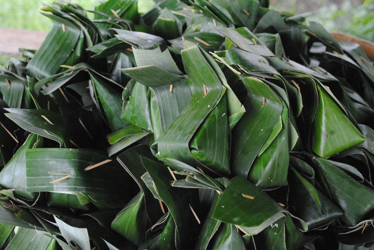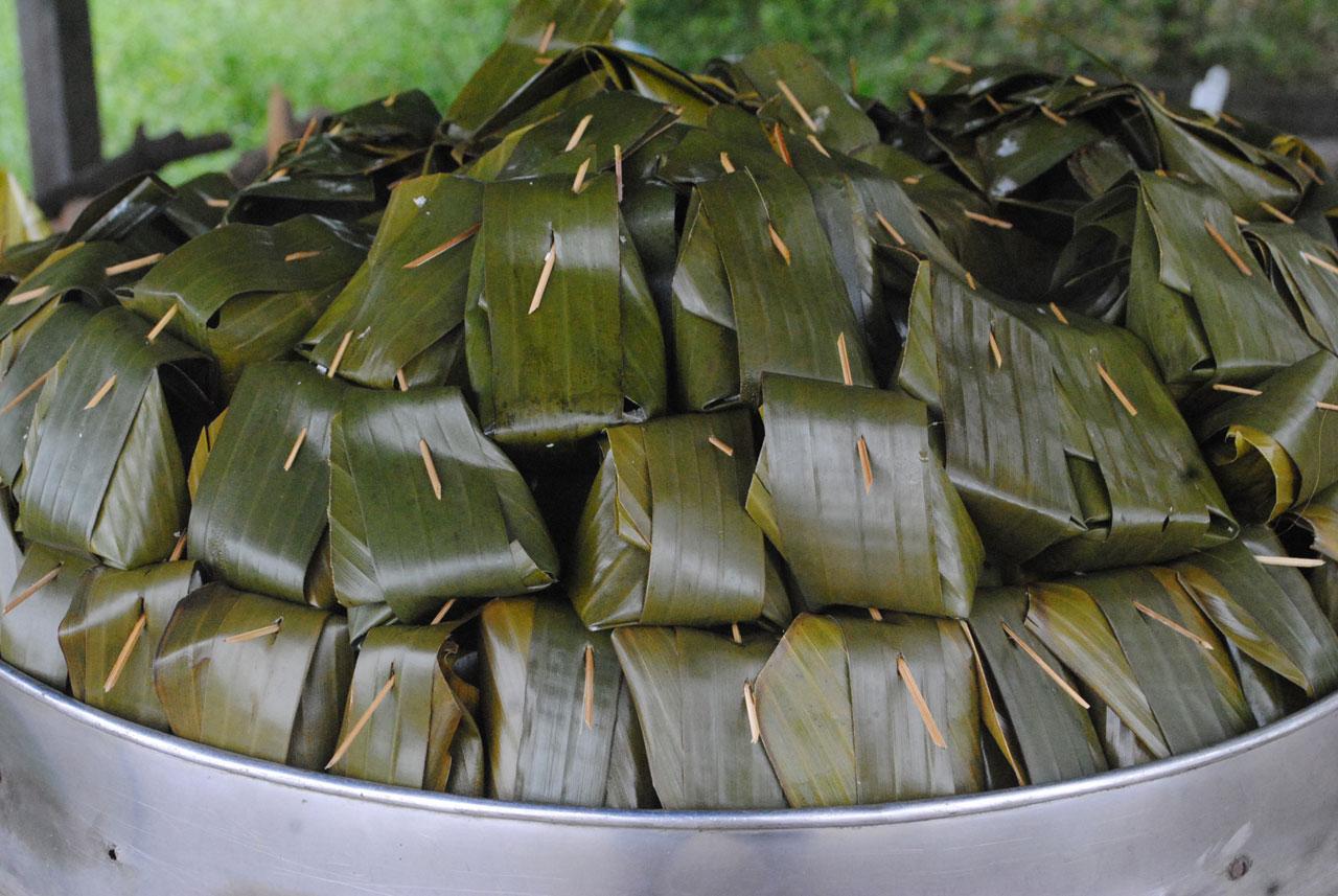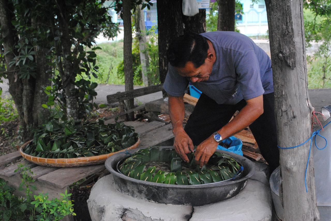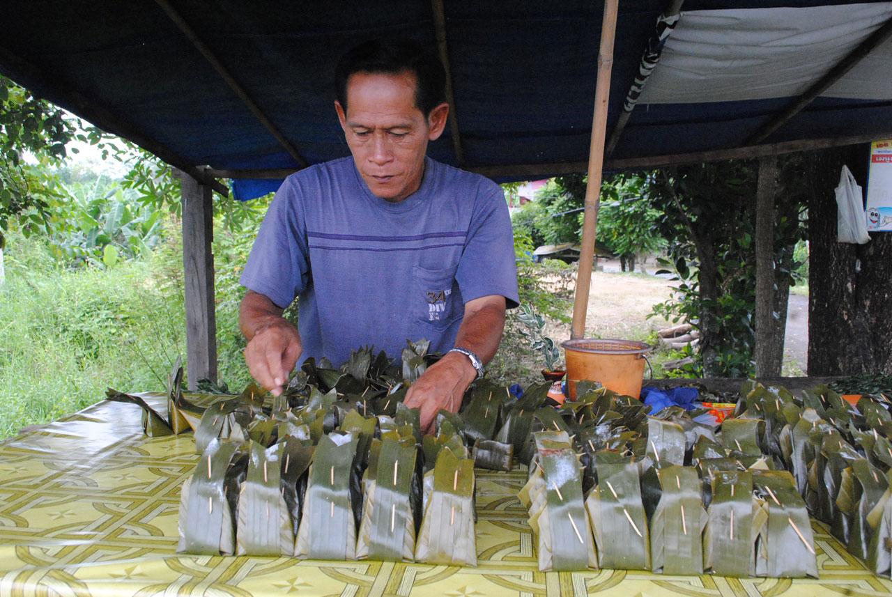 ด้าน ตาตั๊ก เล่าให้ฟังว่า ปกติแล้วที่บ้านตนเองจะทำสวนใบตองและที่บ้านก็จะมีความรู้ เกี่ยวกับการทำขนมไทย โดยเฉพาะขนมแตง ขนมกล้วย ขนมเผือก ขนมฟักทอง และขนมใส่ไส้ ดังนั้นจึงได้ช่วยกันทำขนมและนำมานึ่งขายที่บริเวณหน้าบ้านซึ่งตนก็ได้ขายขนมมากว่า 10 ปีแล้ว จนมีลูกค้าประจำเป็นจำนวนมาก ปกติแล้วตนและภรรยาจะช่วยกันผสมและห่อขนมตั้งแต่เช้ามืด จนประมาณ 6 โมงเช้าก็จะนำขนมที่ห่อเสร็จออกมานึ่งขายที่หน้าบ้าน ซึ่งวันหนึ่ง ตนจะห่อขนมขายวันละ 700 ถึง 800 ห่อ ซึ่งราคาขายปัจจุบันอยู่ที่ห่อละ 3 บาทจากเมื่อก่อนที่ขายห่อละ 2 บาท ซึ่งวันหนึ่งก็ได้กำไรถึงวันละ 500 บาท