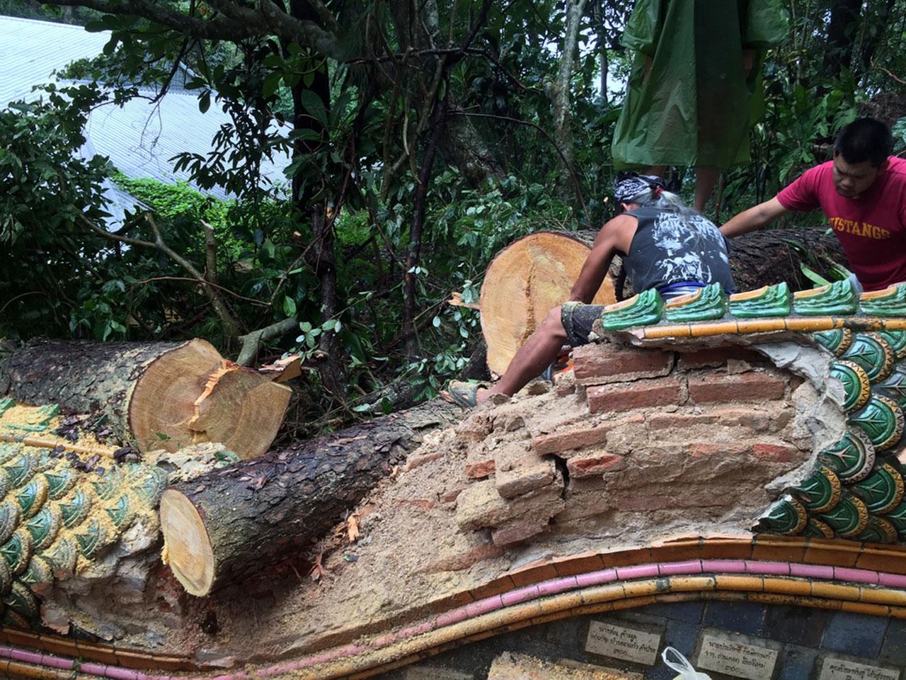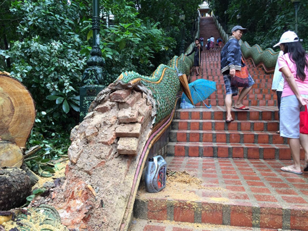 วันที่ 14 ก.ย. ผู้สื่อข่าวรายงานว่า ทางคนงานของวัดพระธาตุดอยสุเทพราชวรวิหาร ได้เร่งทำการนำต้นไม้ที่ล้มทับปูนปั้นรูปตัวพญานาคบริเวณทางขึ้นพระธาตุดอยสุเทพออกไป พร้อมกันนี้ทาง พระธรรมเสนาบดี รอง เจ้าคณะภาค 7 และเจ้าอาวาสวัดดอยสุเทพฯ ได้ร่วมกับทางเจ้าหน้าที่กรมศิลปากร ที่ 4 ได้ตรวจสอบความเสียหาย ลำตัวพญานาค หลังจากถูกต้นสน ขนาด 2 คนโอบ ล้มทับ จากพายุฝนที่ตกลงมาอย่างหนักพบว่า เสียหายเพียงตัวเดียว ความกว้างประมาณ 2 เมตร ลึก 1 เมตร ส่วนอีกตัวไม่พบร่องรอย ความเสียหาย แต่จะตรวจว่า มีรอยร้าวหรือไม่ สำหรับการดำเนินการก่อสร้างบูรณะทาง วัดต้องการให้บูรณะเสร็จภายใน 2 สัปดาห์ แต่พญานาคของวัดได้ขึ้นทะเบียนไว้กับกรมศิลปากร จะต้องมีการตรวจสอบอย่างละเอียด พร้อมเสนองบประมาณในการก่อสร้าง ซึ่งทางวัดเห็นว่า จะต้องใช้เวลานานนับเดือน ทางวัดจะขอใช้งบประมาณในการบูรณะเอง โดยทางบรรดาพ่อค้าแม่ค้า ที่ขายของบริเวณใกล้บันไดนาค ต่างก็แสดงเจตจำนง ขอร่วมบริจาคเงินในการบูรณะก่อสร้าง ในเรื่องนี้จะต้องมีการปรึกษาหารือกันในหลายฝ่ายส่วนเส้นทางบันไดนาค ได้เปิดให้ขึ้นลงตามปกติแล้ว