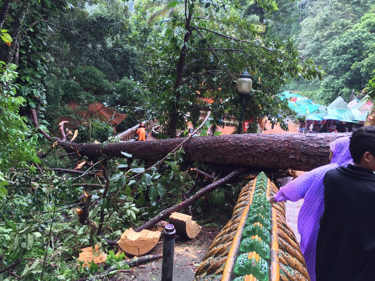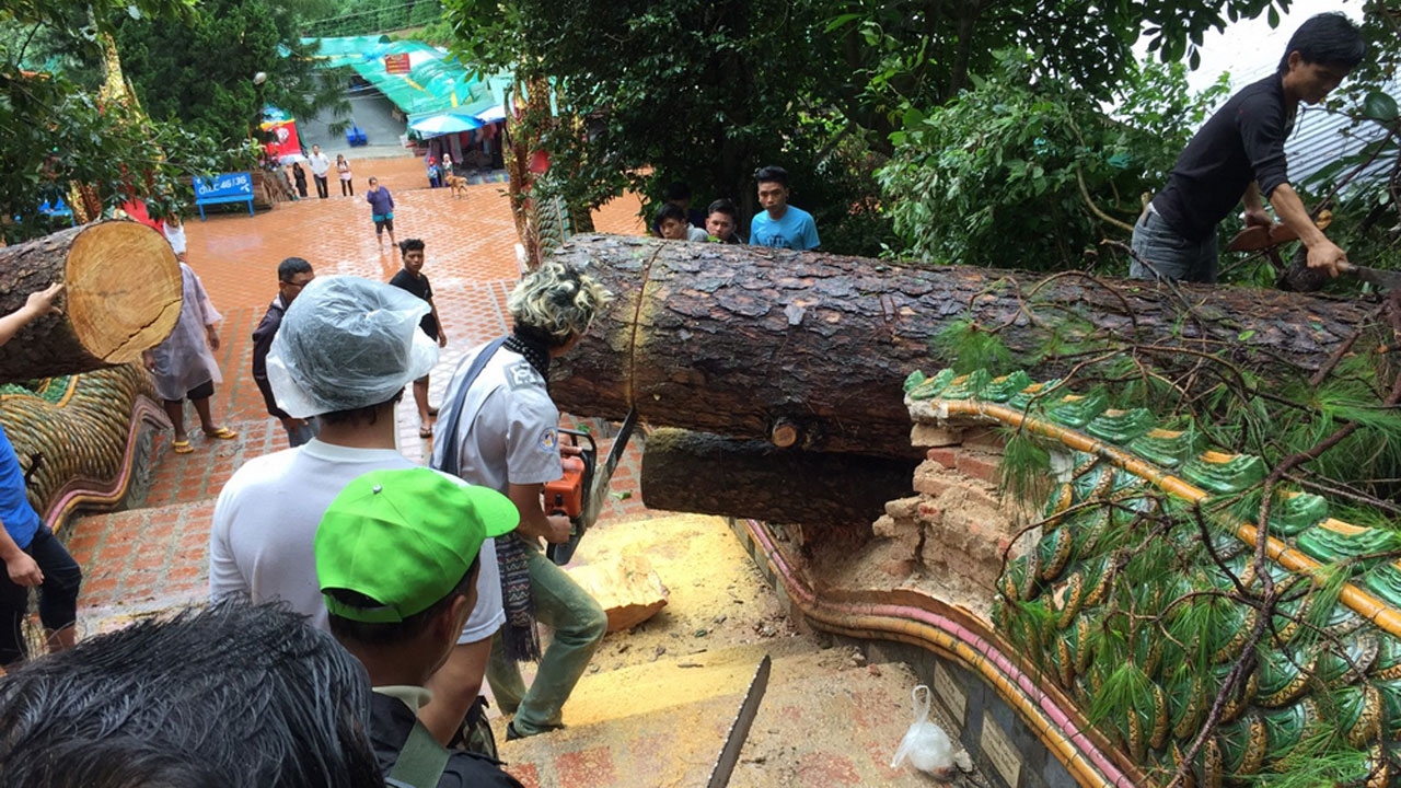 เร่งบูรณะ..คนงานวัดพระธาตุดอยสุเทพราชวรวิหาร จ.เชียงใหม่ ใช้เลื่อยตัดต้นไม้ที่ล้มทับลำตัวพญานาค ทางขึ้นวัดออก เพื่อให้นักท่องเที่ยวเดินขึ้นลงได้ตามปกติแล้ว โดยวัดจะเร่งบูรณะให้เสร็จภายใน 2 สัปดาห์ ยันไม่ใช่เรื่องอาถรรพณ์