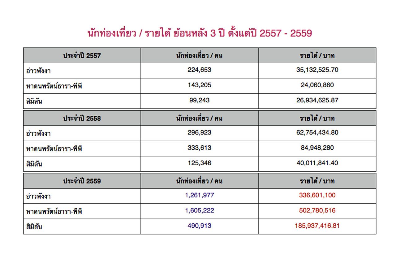 จากเรื่องราวที่เกิดขึ้น ทีมข่าวเฉพาะกิจไทยรัฐออนไลน์ ได้ค้นข้อมูลรายได้และนักท่องเที่ยวของอุทยานแห่งชาติทั้ง 3 แห่งย้อนหลัง 3 ปี โดยทุกปีจะเริ่มนับตั้งแต่เดือนตุลาคมและสิ้นสุดที่เดือนตุลาคมของอีกปี เช่น งบประมาณประจำปี 2557 จะนับตั้งแต่เดือนตุลาคม 2556 ถึงเดือนตุลาคม 2557 ซึ่งได้ตัวเลขดังนี้